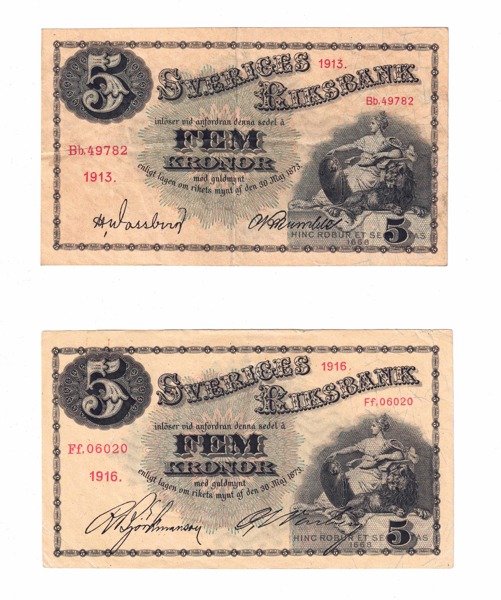 SEDLAR. 5 kronor 1913, 1916. Totalt 2 ex.