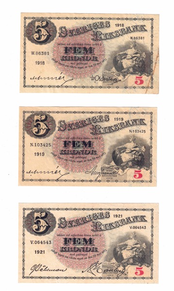 SEDLAR. 5 kronor 1918 (tejpad), 1919, 1921, 1922, 1927, 1928. Totalt 6 ex.