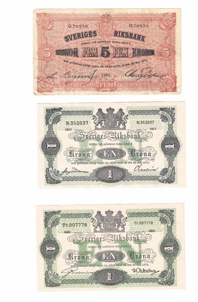 SEDLAR. 5 kronor 1890, 1 krona 1917, 1920. Totalt 3 ex.