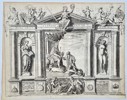 "Mihi Absit Gloriari Nisi in Domino" depicts an elaborate architectural frontispiece. The scene features a central monarch enthroned and receiving a kneeling figure, flanked by statues in niches and topped with a pediment containing allegorical figures. The work is highly detailed, incorporating symbolic elements and classical architectural motifs characteristic of Renaissance book design. This copperplate engraving serves as a significant illustrative plate for a scholarly work on symbolism and heraldry. It originates from a Venetian publication, documenting the complex iconography associated with sixteenth-century nobility and power.