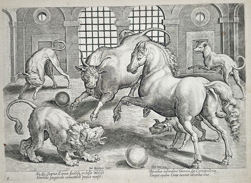Sic Leo, Taurus, Equus, facileque, in bella Molossi. The engraving depicts an intense confrontation within a walled enclosure. A bull, a lion, and a horse are the central figures, surrounded by several hounds. Spheres are placed on the ground in the foreground. The work is part of the series Venationes Ferarum, Avium, Piscium, which documents various hunting scenes and exotic animal encounters. It was published in the late sixteenth century.