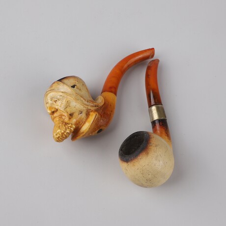 Bilder Pipor, 2 st, sjöskum och bärnsten, en m. silverbeslag