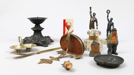 Bilder Konsolhylla, figuriner, bläckhorn mm, längd 44 cm och minder