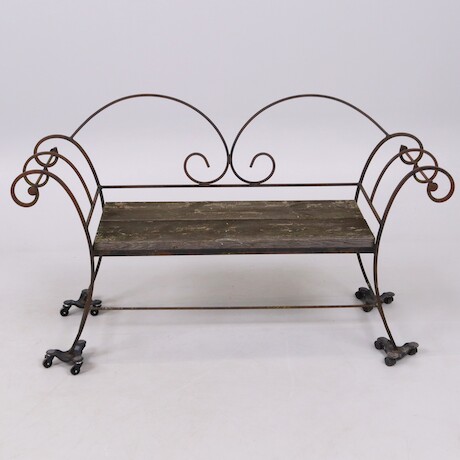 Auktioner Möbler Trädgårdssoffa. smide och trä. 1900-taletsmitt. 152x45x88 cm (BxDxH)