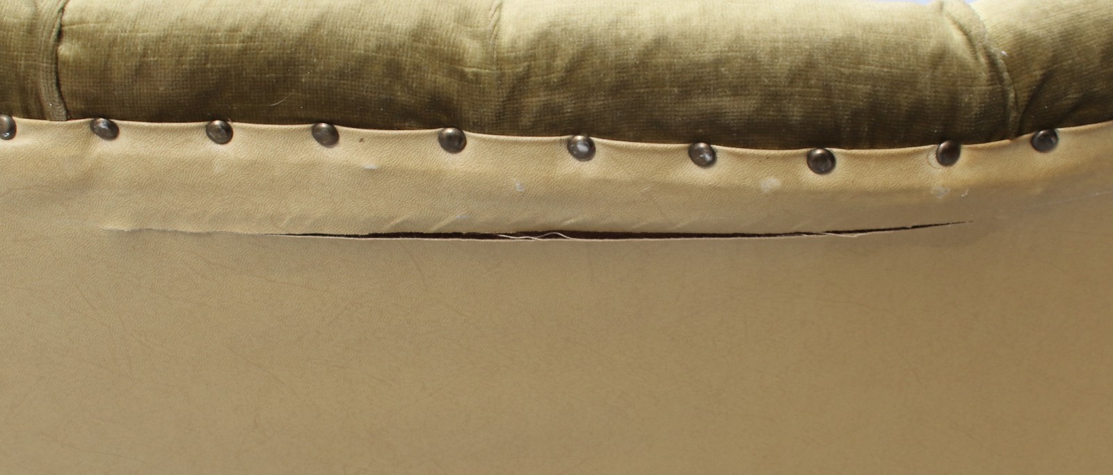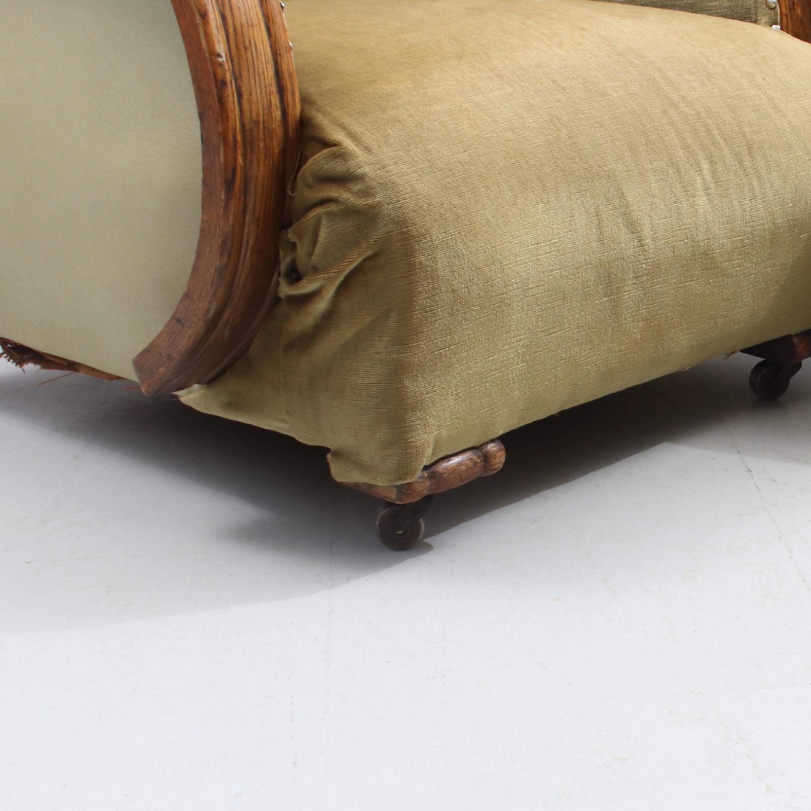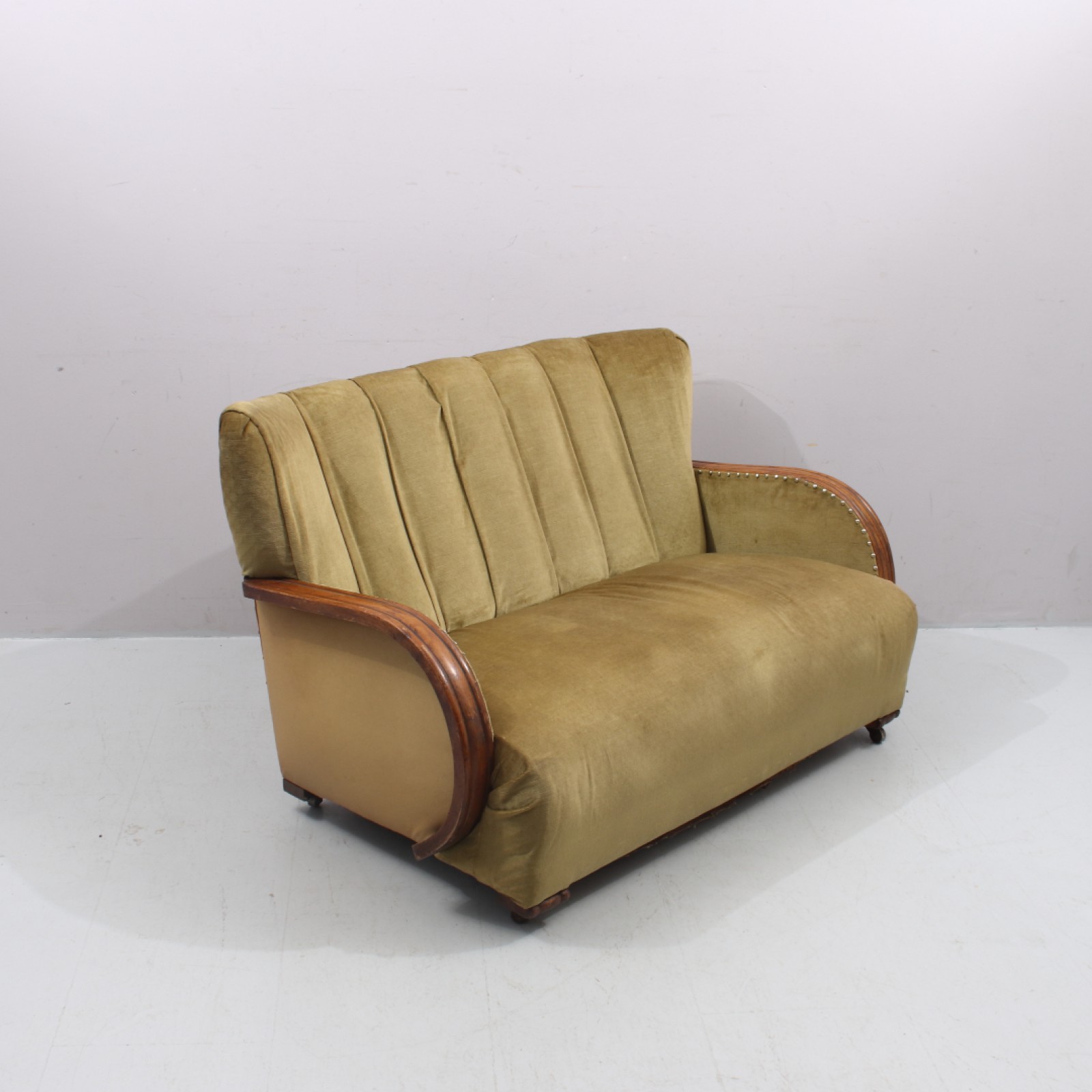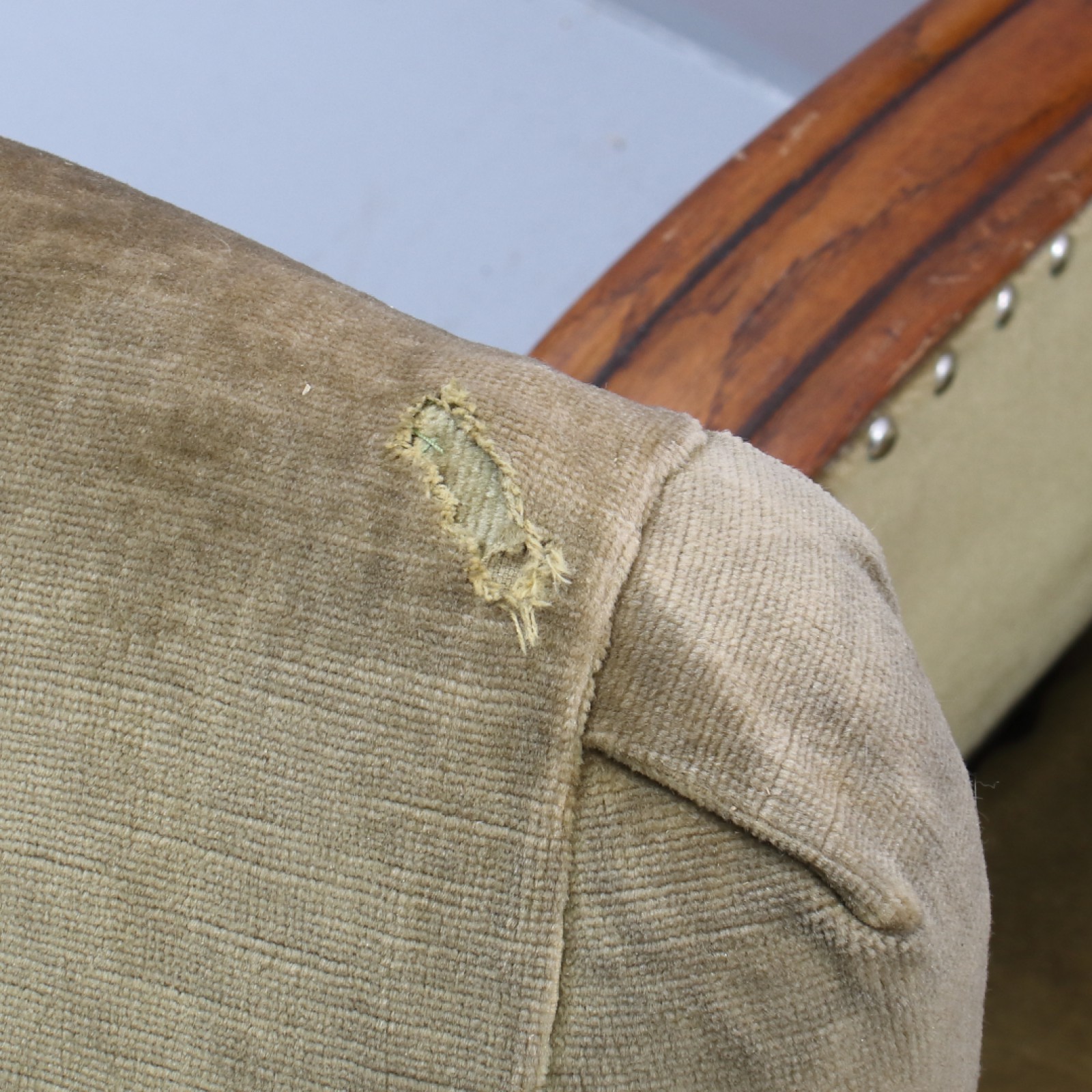 3 delar, 2st fåtöljer samt 1st soffa, karma med ljus ek, 1930-tal, klädsel med plyschtyg, kapade ben med senare påsatta hjul, senare klädsel, tyg ställvis med slitage och skador, fåtölj Rh.75, B.68, Sh.32 cm, soffa Rh.78, B.128, Sh.34 cm. (vån1)