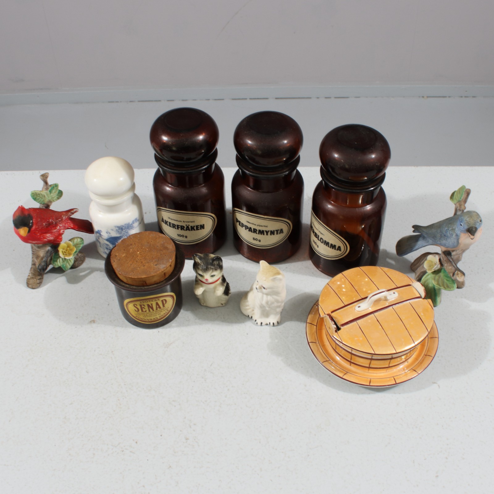 10 delar, 1st Rörstrand sillburk, 4st figuriner, 4st apoteksflaskor i glas samt 1st Gustavsberg senap, höjd 17 cm och lägre. (vån3)