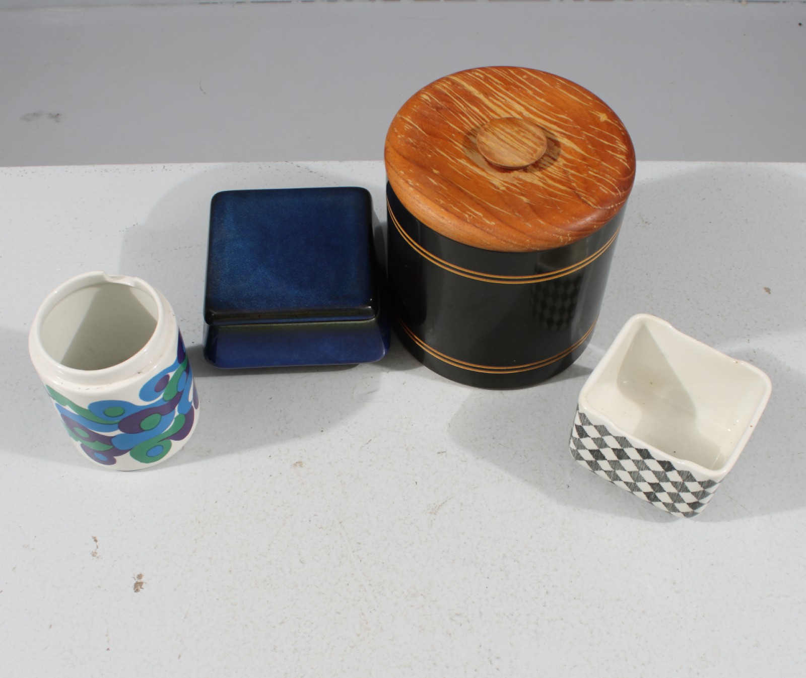 4 delar, 1st Rörstrand "Red Top" (saknar lock), 1st Arabia "Mimmi" (saknar lock), 1st Gustavsberg "Lagun" samt 1st Töreboda med teaklock, höjd 7-15,5 cm. (vån3)