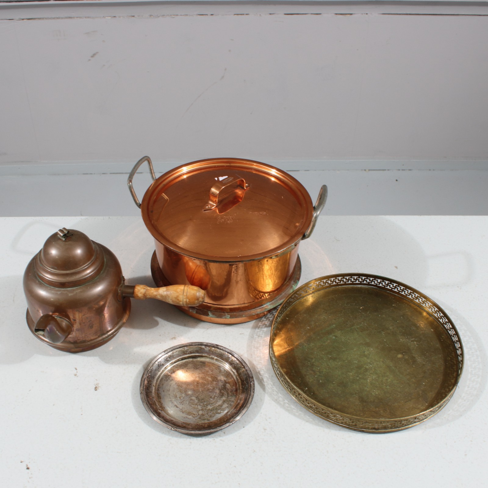 4 delar, gryta samt kaffekanna i koppar, 1 serveringsfat i mässing samt 1st mindre fat i nysilver. (vån3)