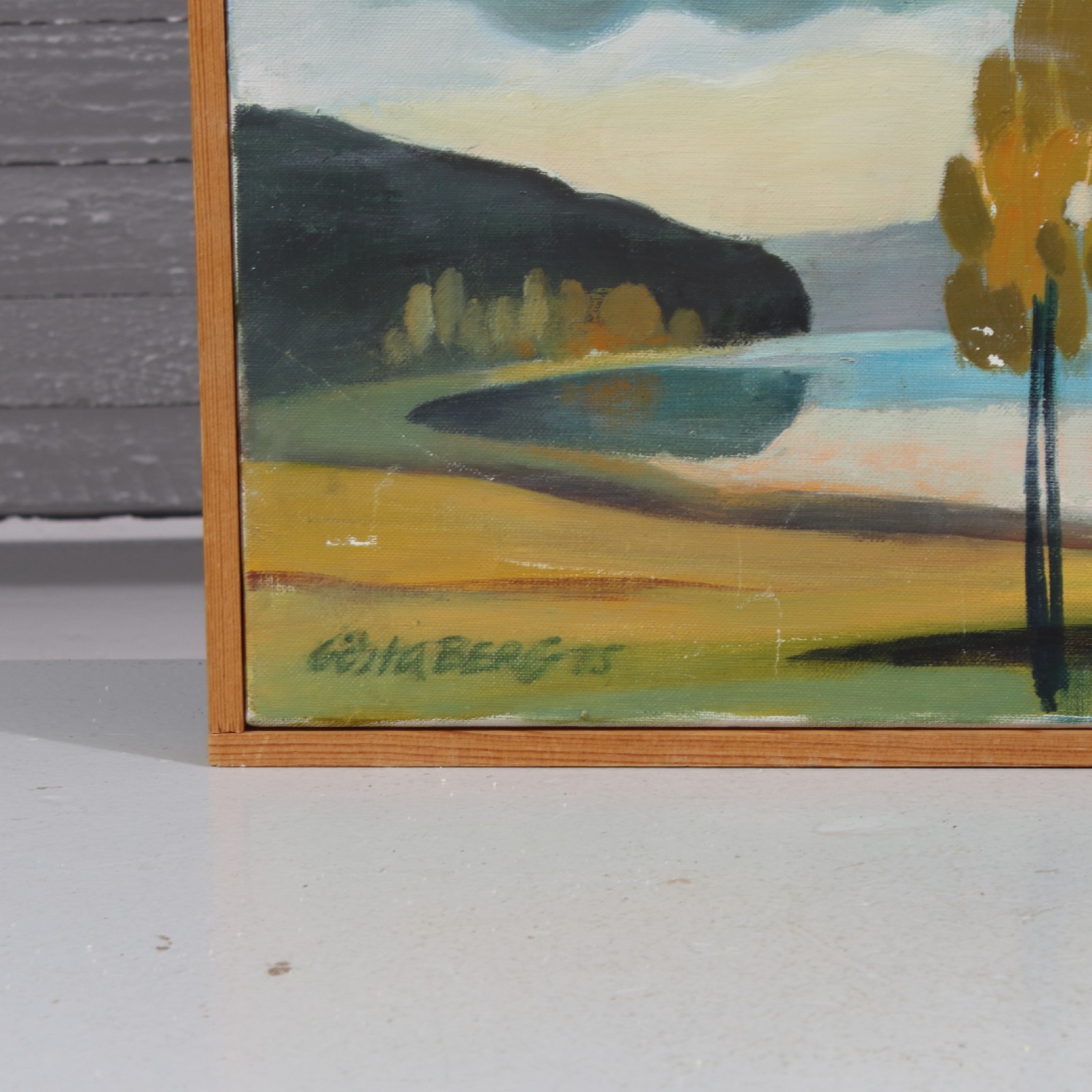 Olja på duk, "Naturscen vid sjö", ram 26,5x43 cm. (vån3)
