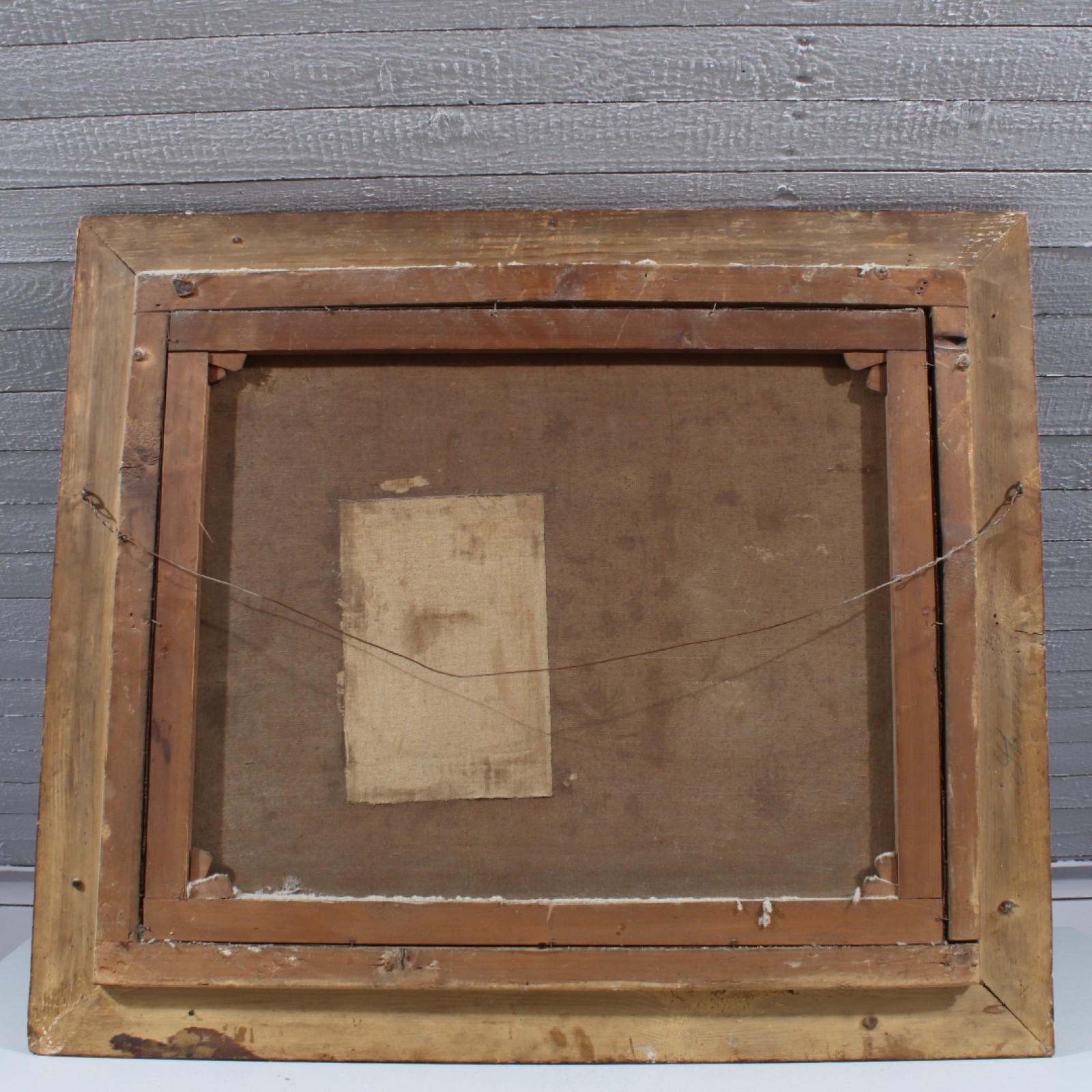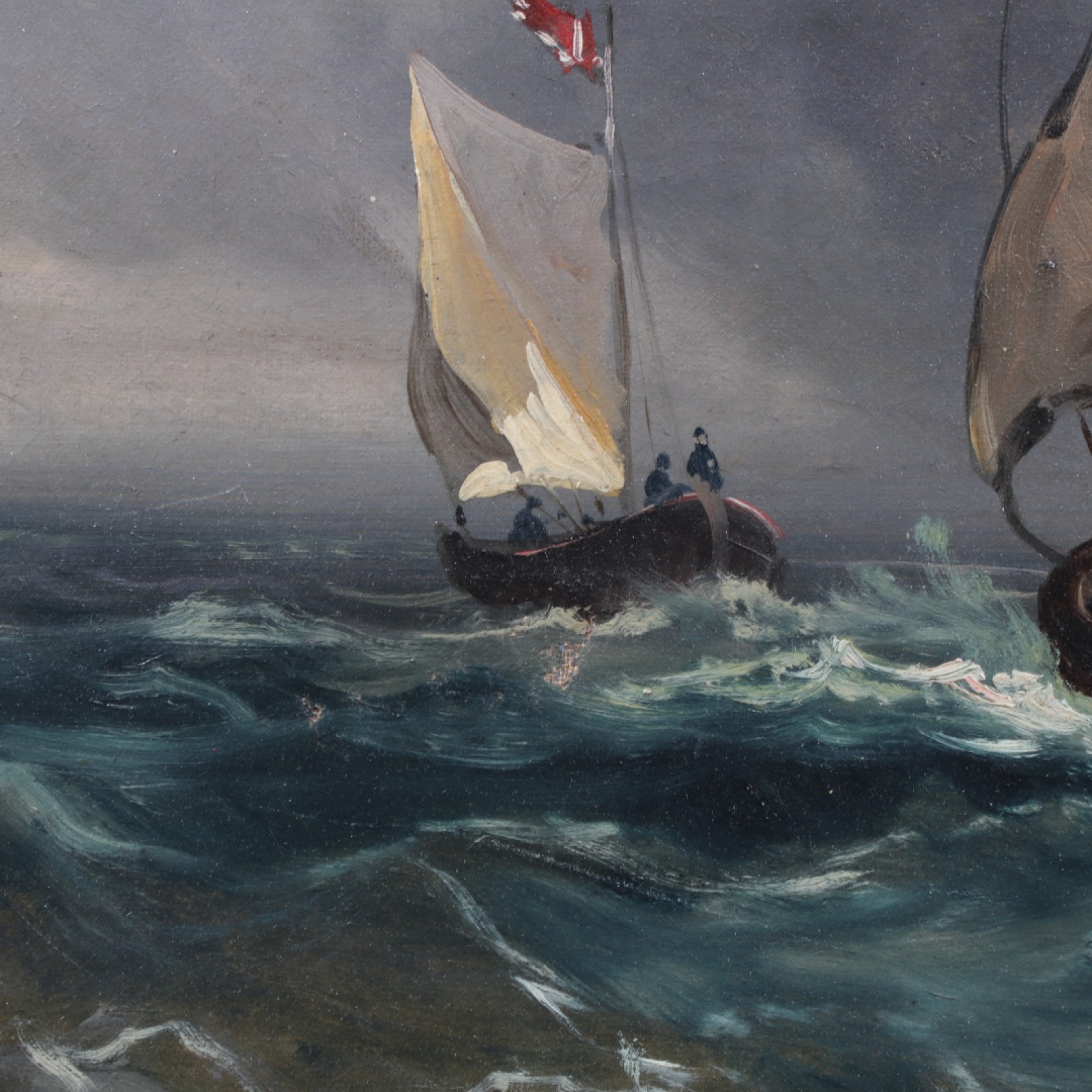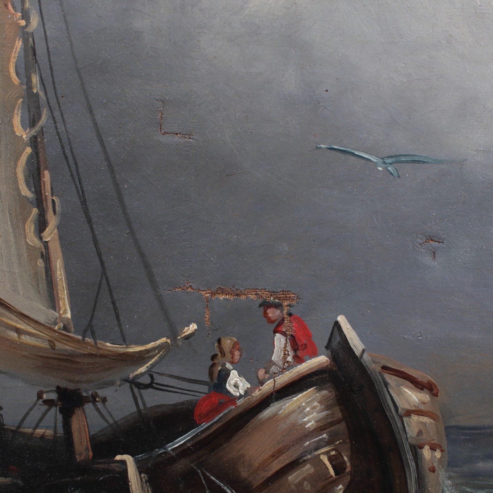 Äldre oljemålning på duk, Fiskebåtar på hav", 4st dukskador samt ram med 2st avslag, ram 76x89 cm, bild 53x66 cm. (vån3)