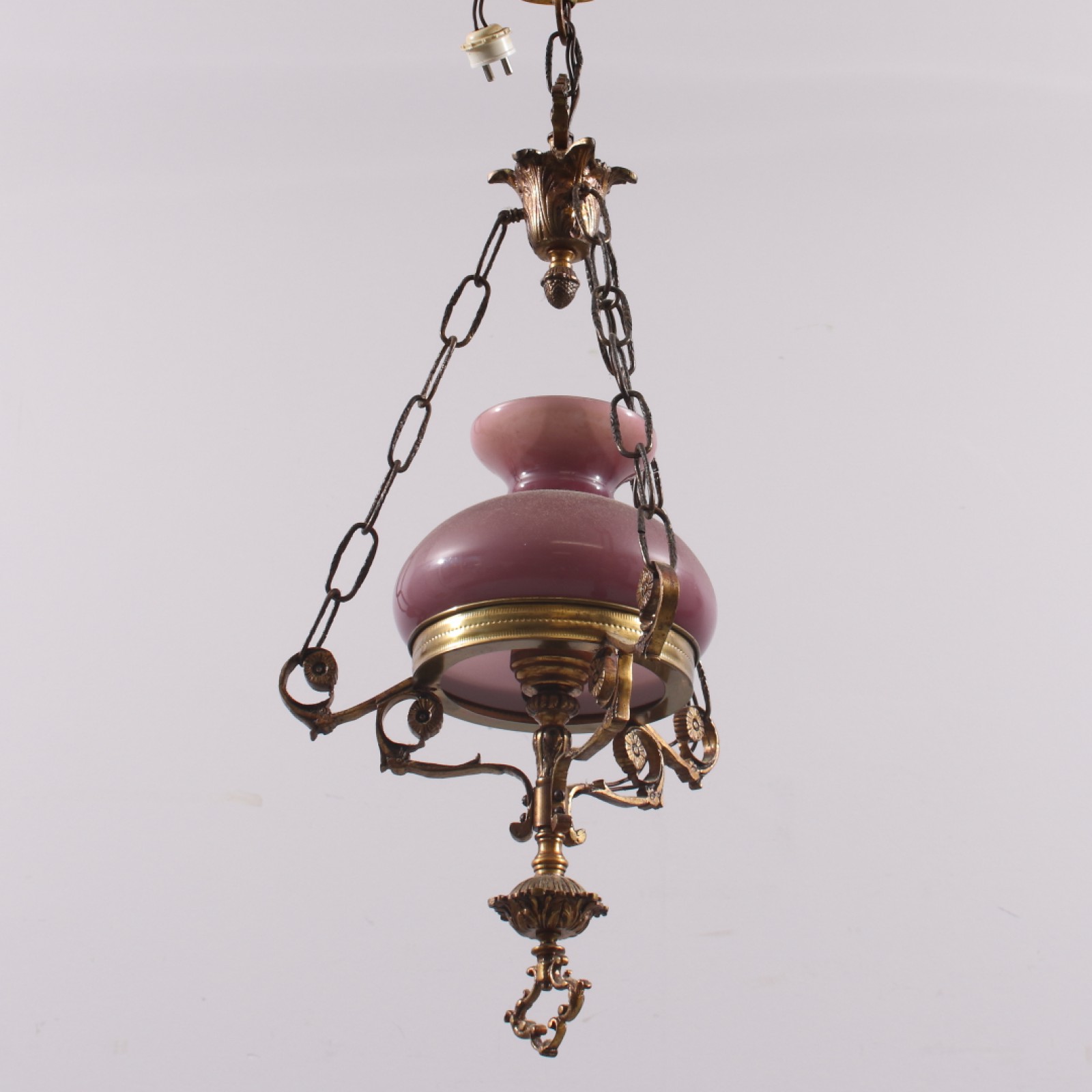Stomme i patinerad mässing, skärm i glas, höjd 62 cm, bredd 25 cm. (vån1)
