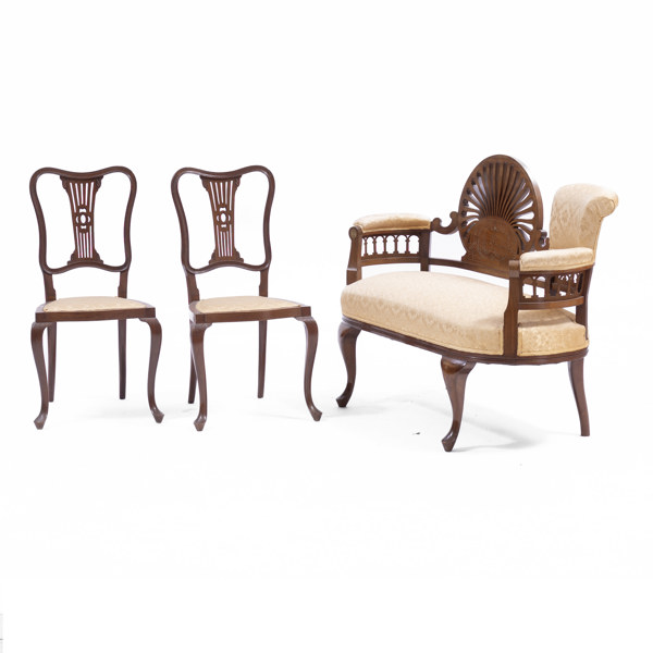 1900-talets första hälft, fanerat i mahogny, sitthöjd 45, soffans längd 120 cm
