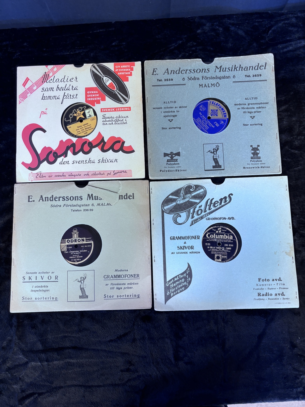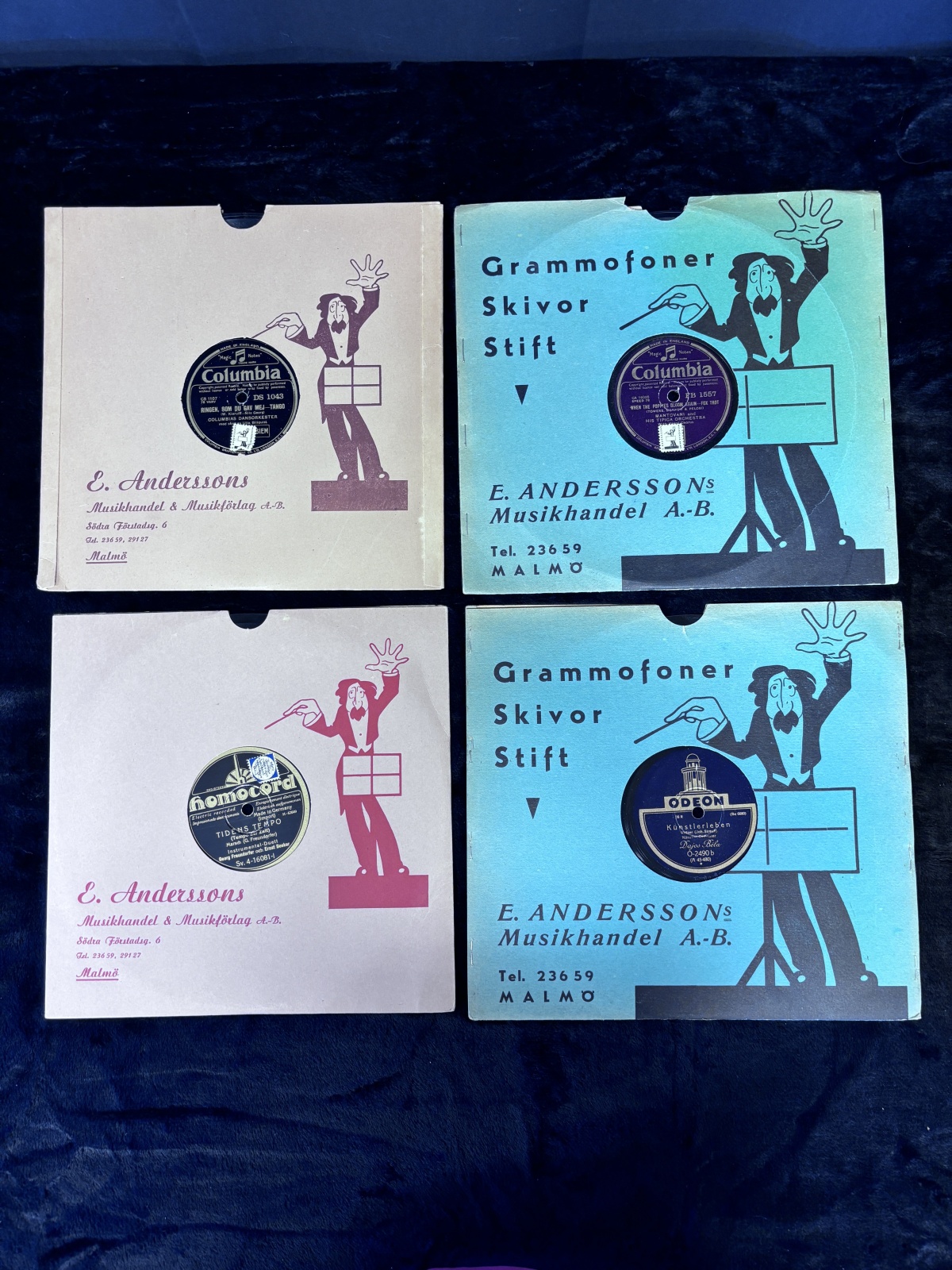 En blandad samling äldre 78-varvsskivor med originalfodral, huvudsakligen från Odeon, Columbia, Parlophon, Homocord, His Master’s Voice (HMV) samt svenska etiketter som Sonora och Telefunken. Flera fodral är märkta med klassiska musikhandlare såsom E. Anderssons Musikhandel, Malmö.