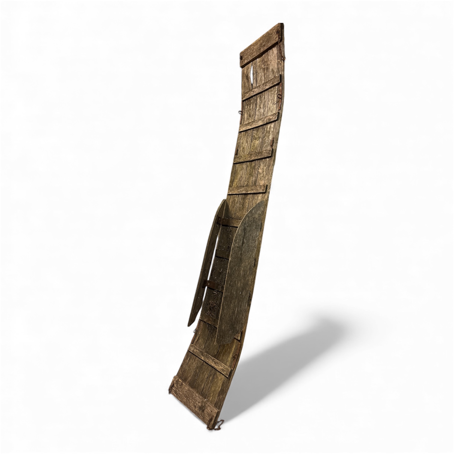 Charmig och ovanlig antik trädsläde, troligen använd som hösläde / dragkälke på gård under 1800- eller tidigt 1900-tal. Släden är handbyggd i grovt trä med original detaljer som järnbeslag, kedjor och sidostycken. Den vackra patinan visar tidens slitage och ger ett autentiskt, dekorativt uttryck.