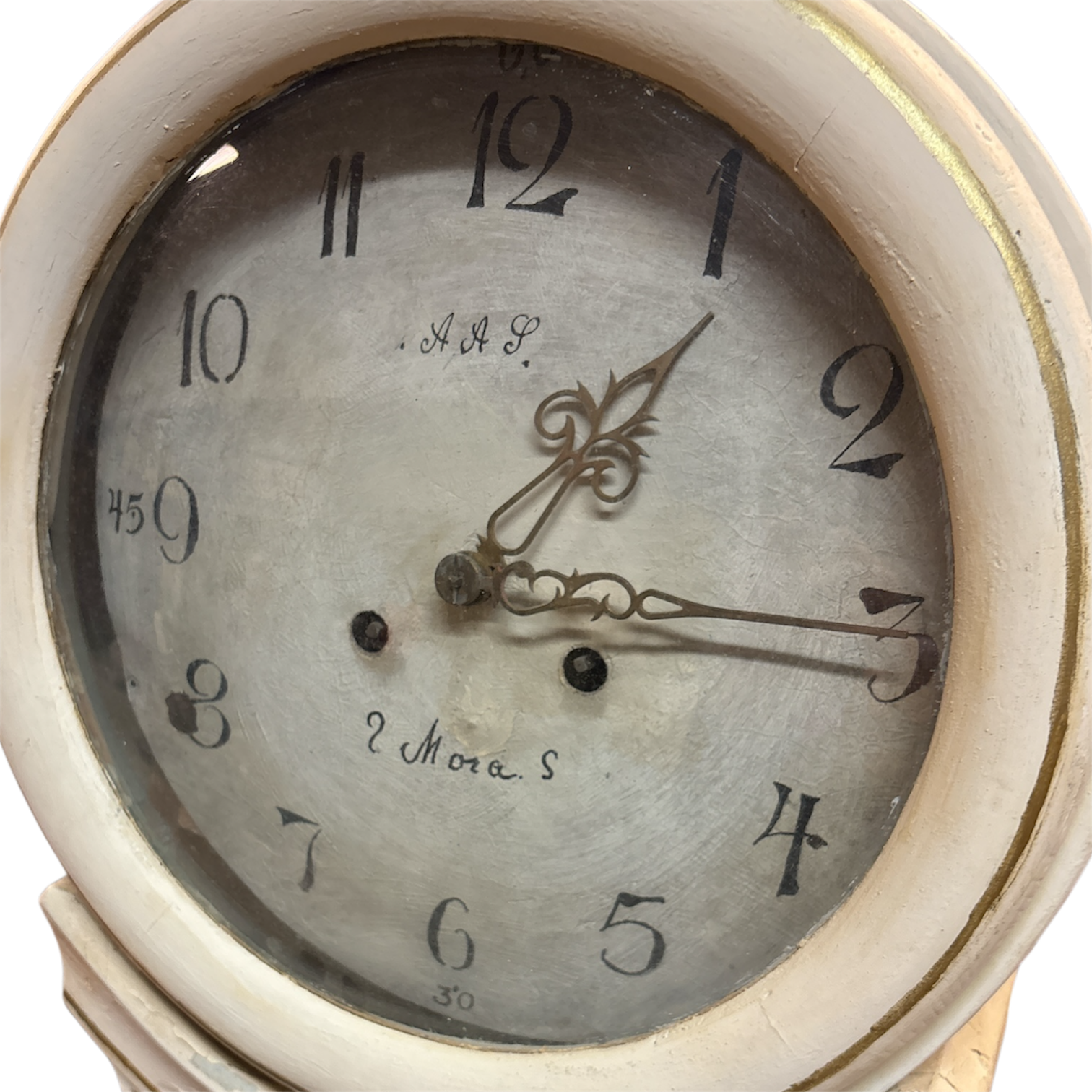 Dekorativ golvklocka i Moraklockestil med handmålad blomdekor och ljus bemålning. Klockan har klassisk svensk allmogeform med rund urtavla och svängt skåp.