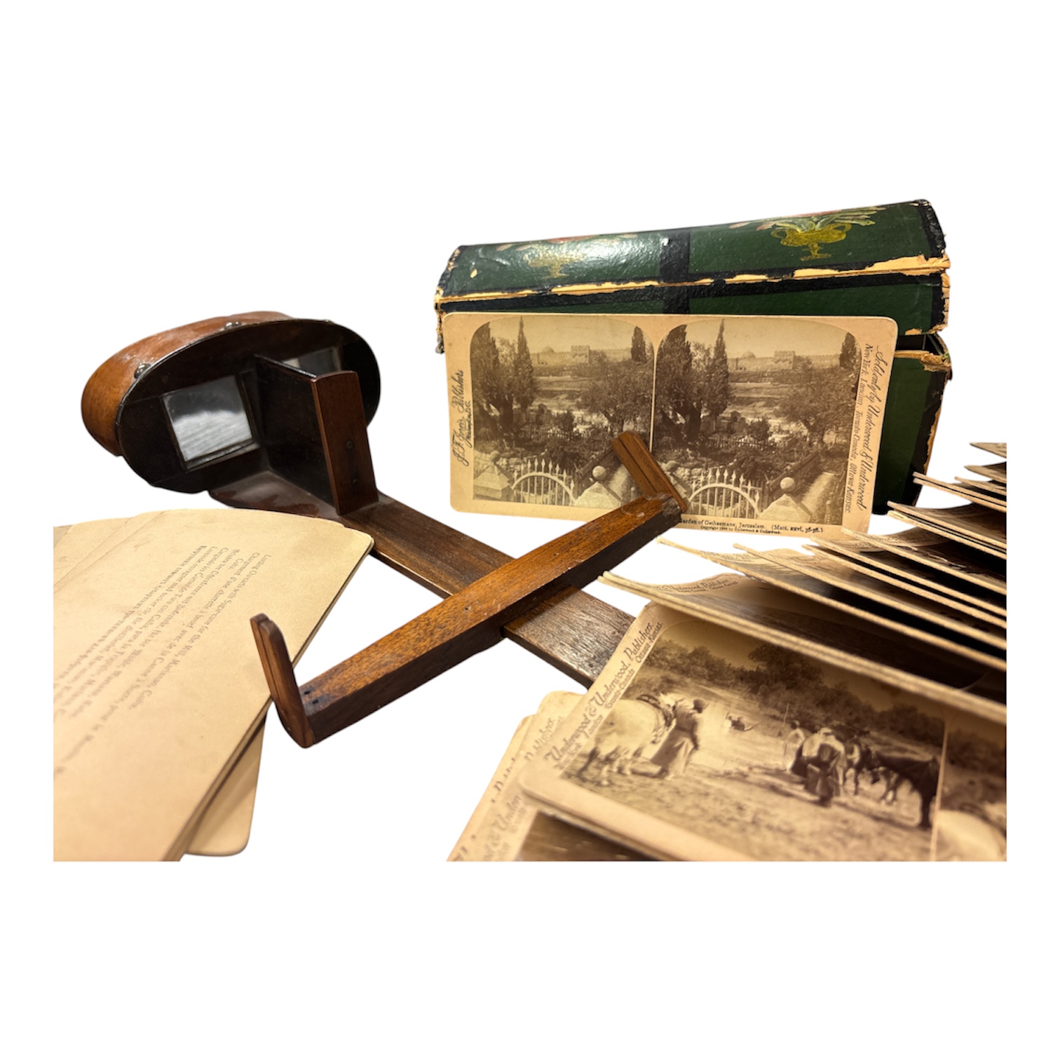 Antikt stereoskop i trä tillsammans med en större samling stereoskopiska fotografier (stereokort) från slutet av 1800-talet / början av 1900-talet. Stereoskop användes för att betrakta fotografier i 3D-effekt, en mycket populär form av underhållning och bildvisning under den viktorianska tiden.