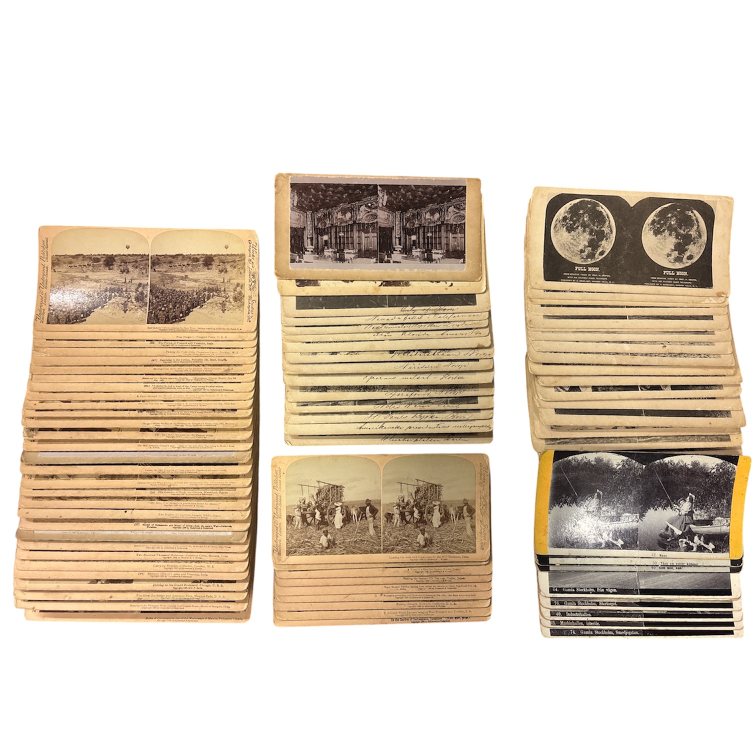 Motiven omfattar bland annat historiska miljöer, landskap, vardagsliv, industriella miljöer och vetenskapliga motiv (bl.a. astronomi). Flera kort har tydliga bildtexter och numrering, vilket ofta efterfrågas av samlare då de tillhör olika stereoserier från den tidiga stereofotografins storhetstid.
