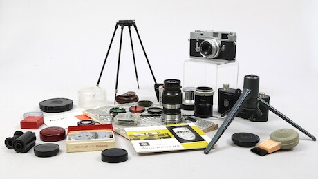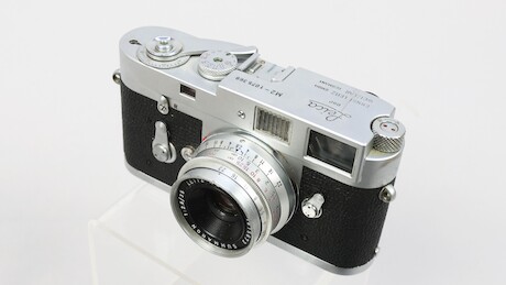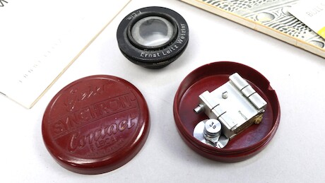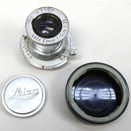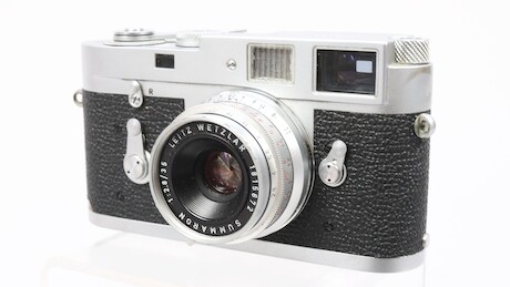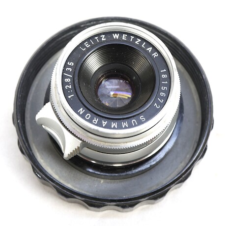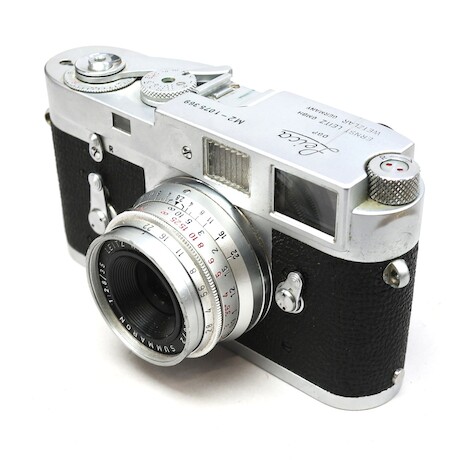 Bilder Systemkamera, Leica M2, 1963, serienummer 1075369, 3 objektiv, Elmar f=9cm 1:4, Summaron 1:2,8/35, Leitz Elmar f=5cm 1:3,5, Leica Meter MR, linser, manualer, stativ 2 st Leitz mm