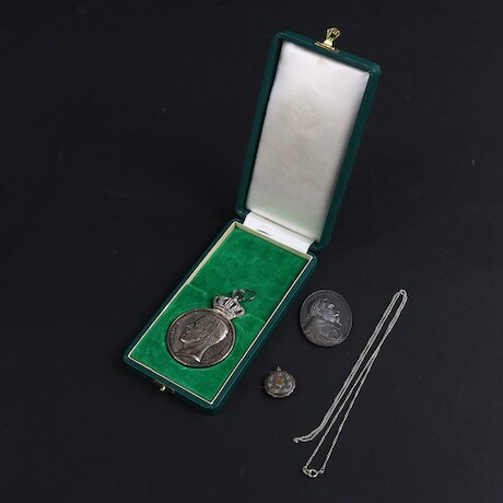 Bilder Medaljer 2 st silver + halsband med berlock, vikt 71 gram