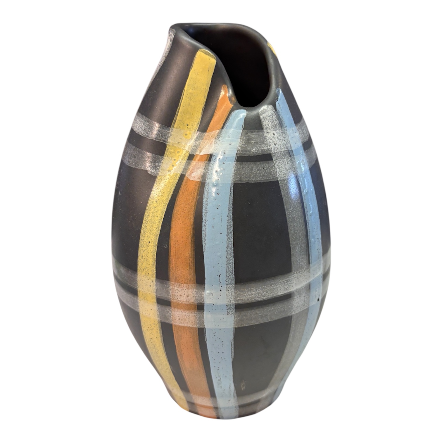 En mycket dekorativ och färgstark vintagevas från välkända Bay Keramik, Västtyskland. Vasen tillhör den ikoniska serien "Turin", som kännetecknas av sin djupa svarta glasyr och de karaktäristiska handmålade ränderna i gult, orange, ljusblått och vitt