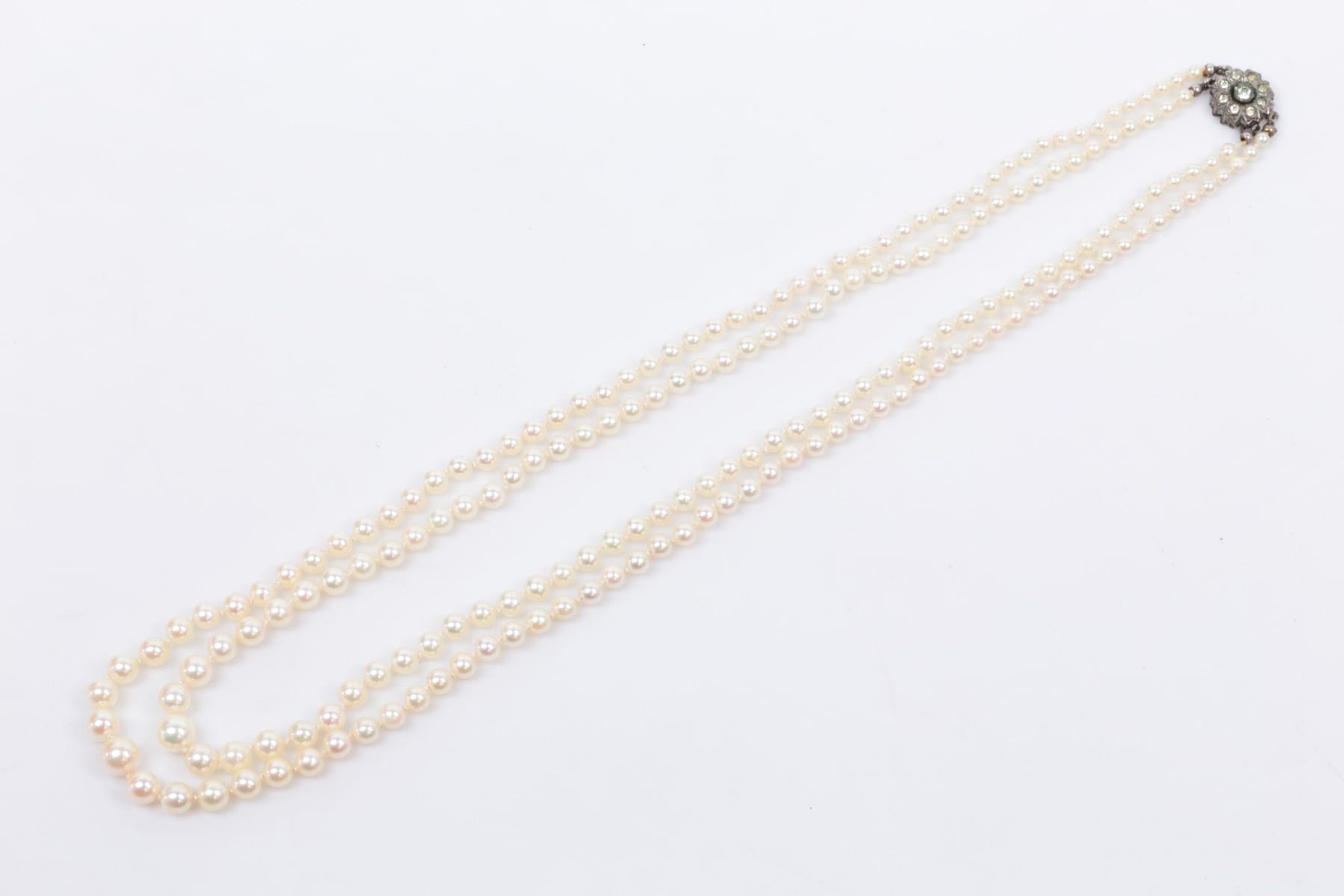 COLLIER med odlade pärlor, dubbelradigt, doserat, lås i silver med vita stenar