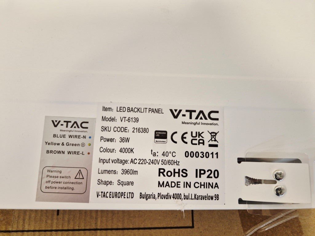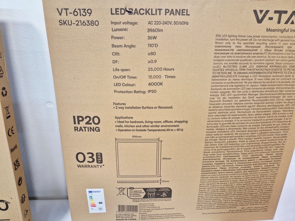4st LED-paneler V-Tac 220/240VModell: VT-6139Mått: 595x595x30mm