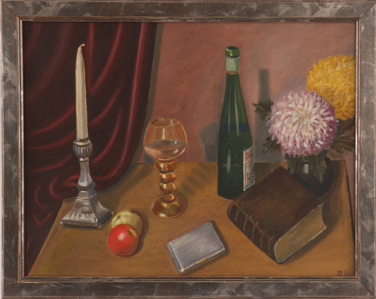 Olja på pannå, stilleben. Monogramsignerad.
