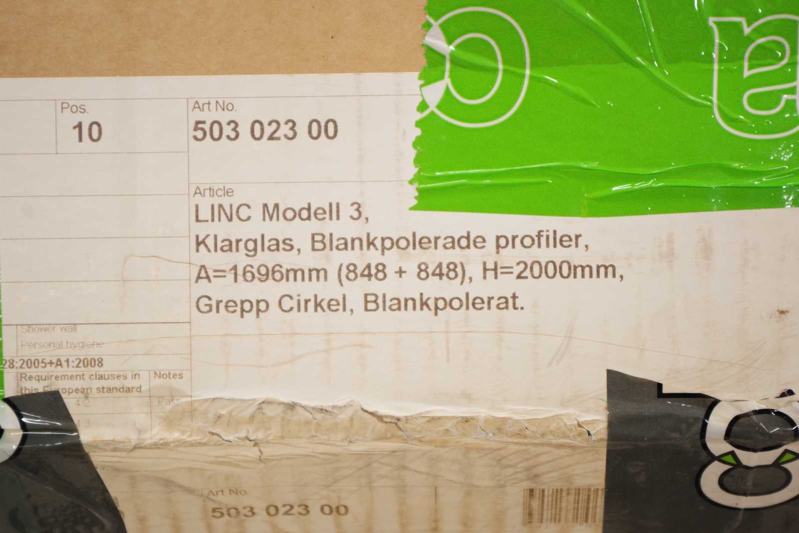 Bilder DUSCHVÄGGAR paret, INR "LINC Modell 3", klarglas med blankpolerade profiler, H: 200cm B: 848mm/st (nyskick/oanvända) OBS! 25% moms tillkommer på klubbat pris.