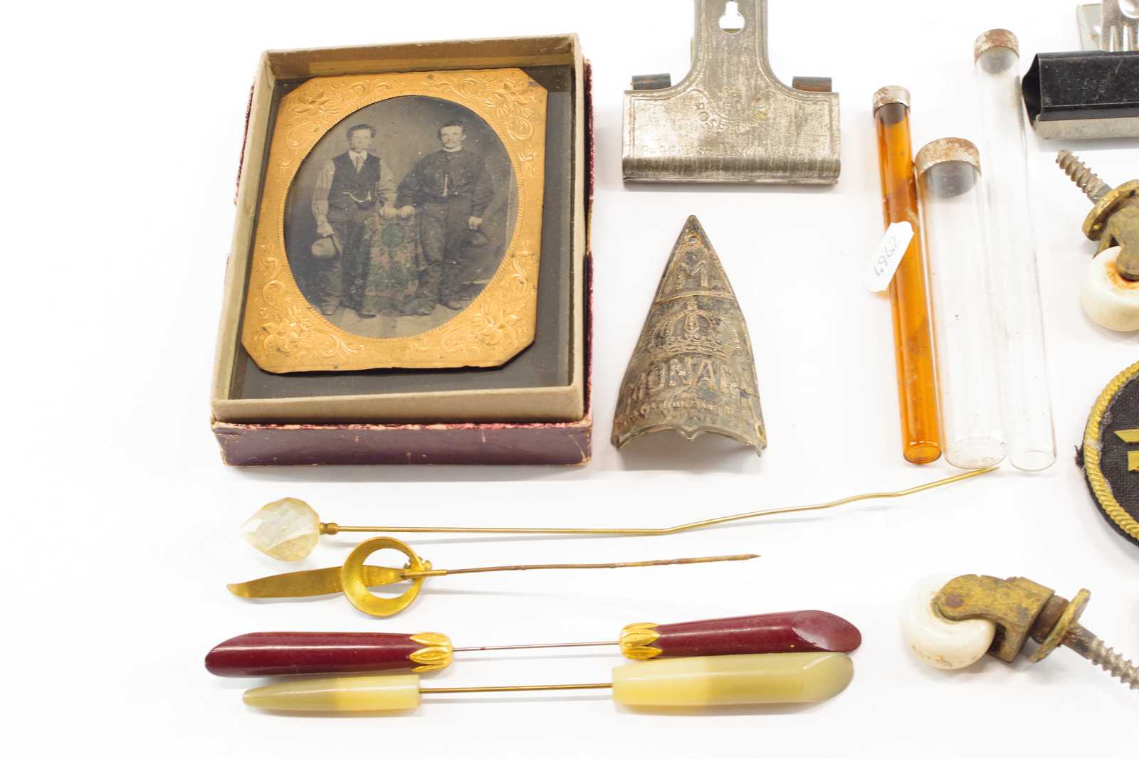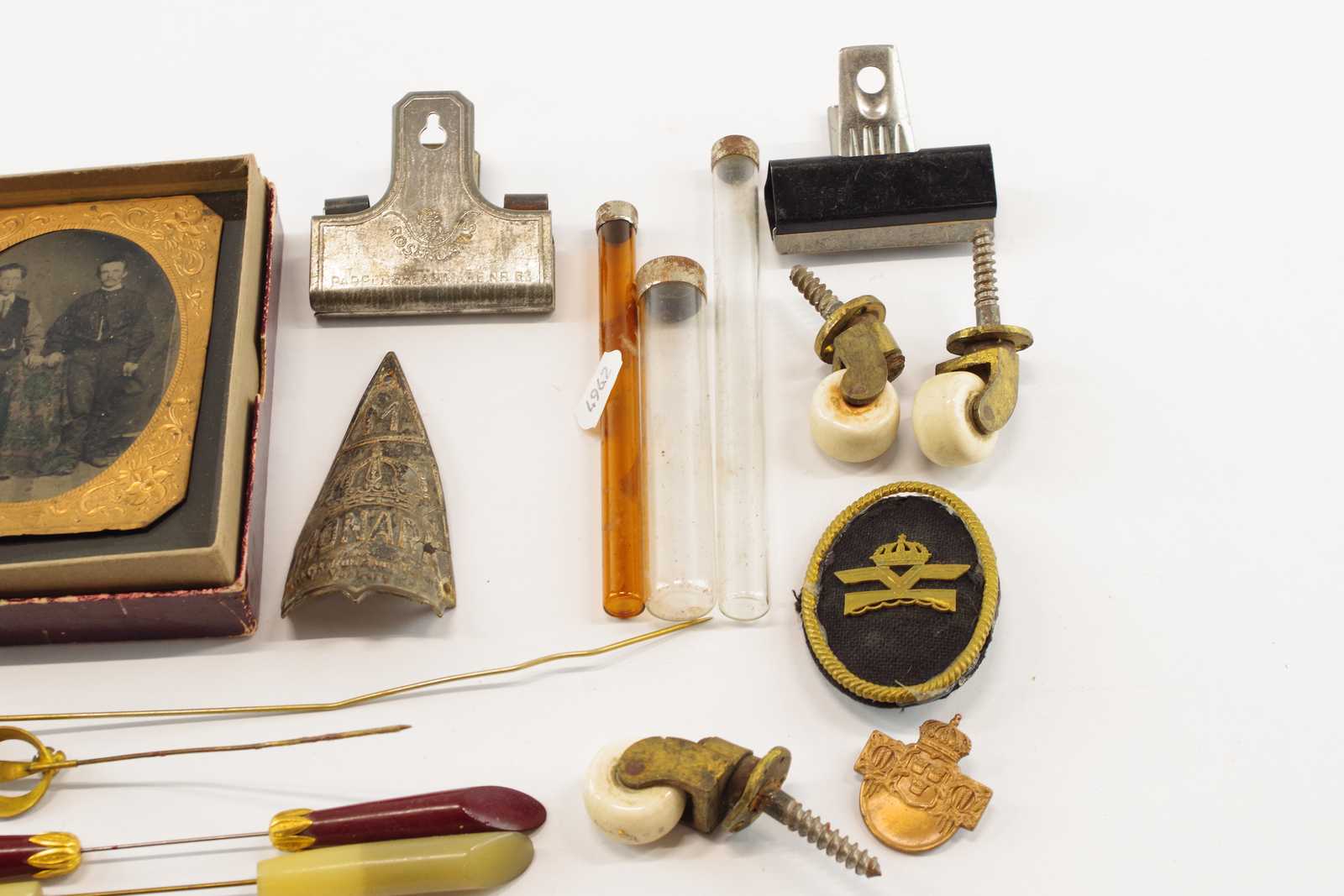 Bilder KURIOSA KLÄMMOR, MONARKEMBLEM, MÖBELHJUL, RAM, HATTNÅLAR mm