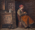 18/1900-tal. handarbetande kvinna i interiör, daterad 1908, olja på duk, bildmått 64 x 76 cm