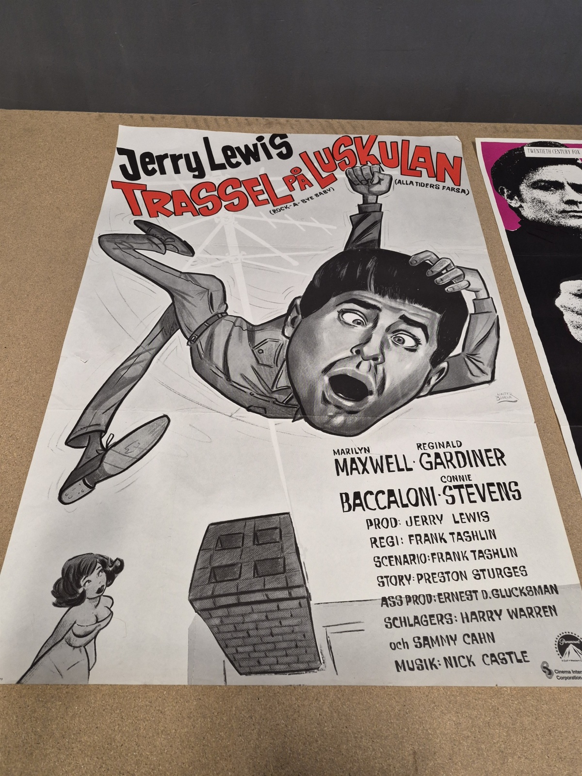 Auktioner Filmposters 2 st; Trassel på luskulan Jerry Lewis och Den sicilianska klanen, veck och någon reva finns, mått 100x70 cm