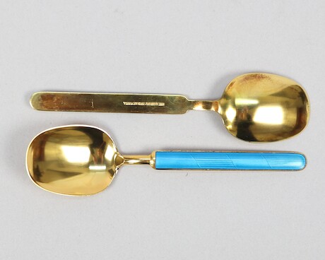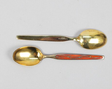 Auktioner Guld, Silver & Smycken Skedar 6 st, TH Marthinsen, Norge, förgyllt silver och emalj, vikt 157 gram