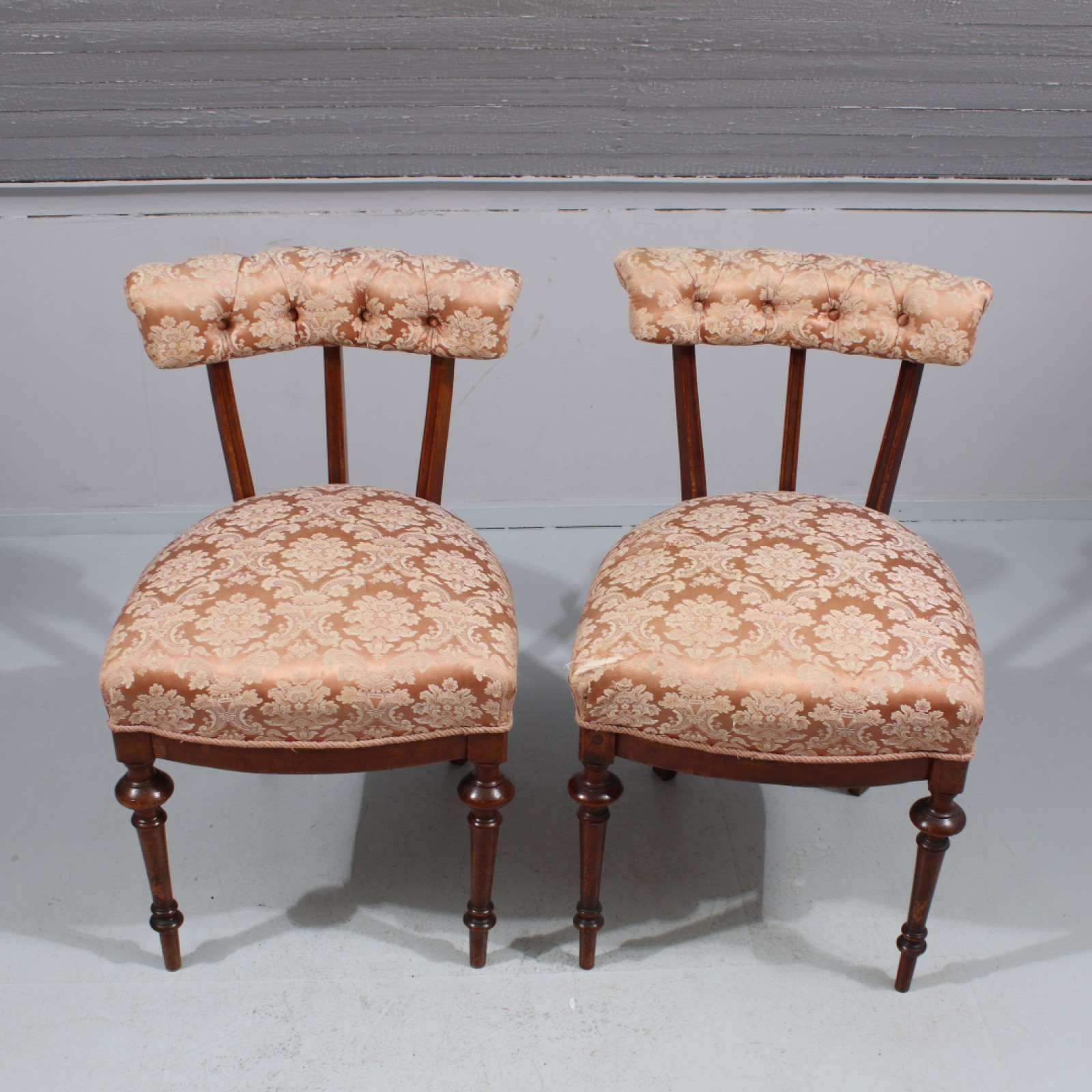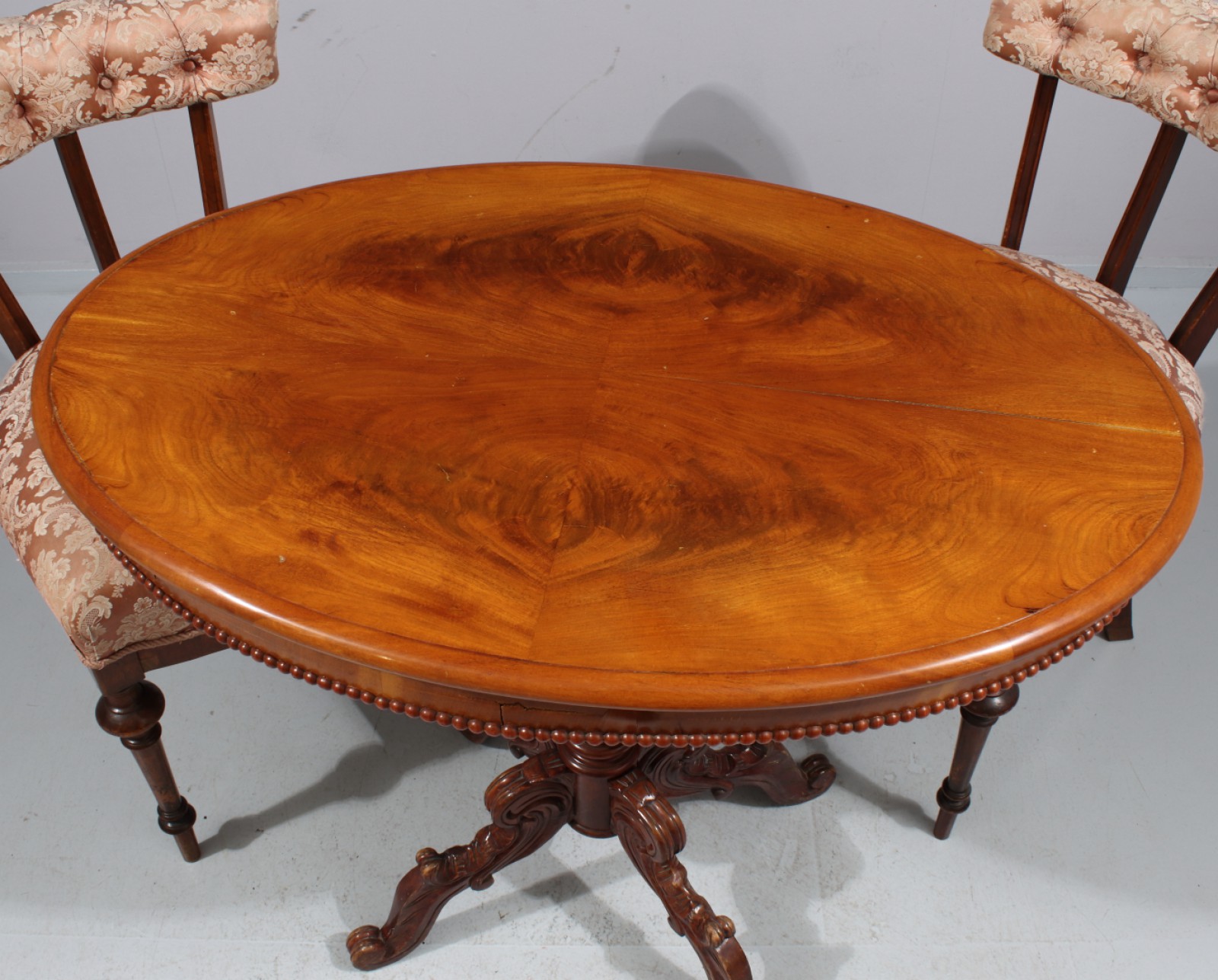 3 delar, 1900-talets första hälft, 1st salongsbord H.73, L.89, B.58 cm, 1 par stolar Rh.78, B.45, Sh.50 cm, tyg ställvis med slitage och fläckar. (vån3)