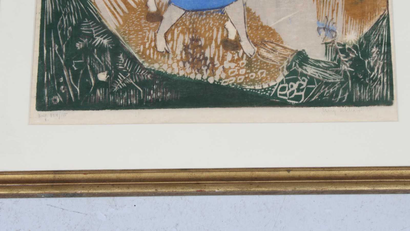 Träsnitt, "Kvinna med häst", signerad samt numrerad 104/115, ram 66x54 cm, passepartout 50x40 cm. (vån3)