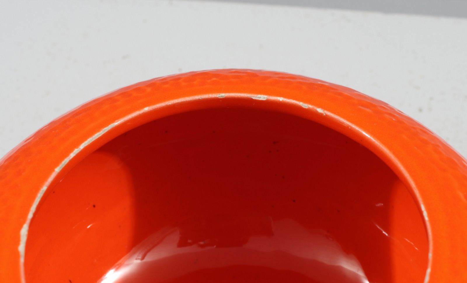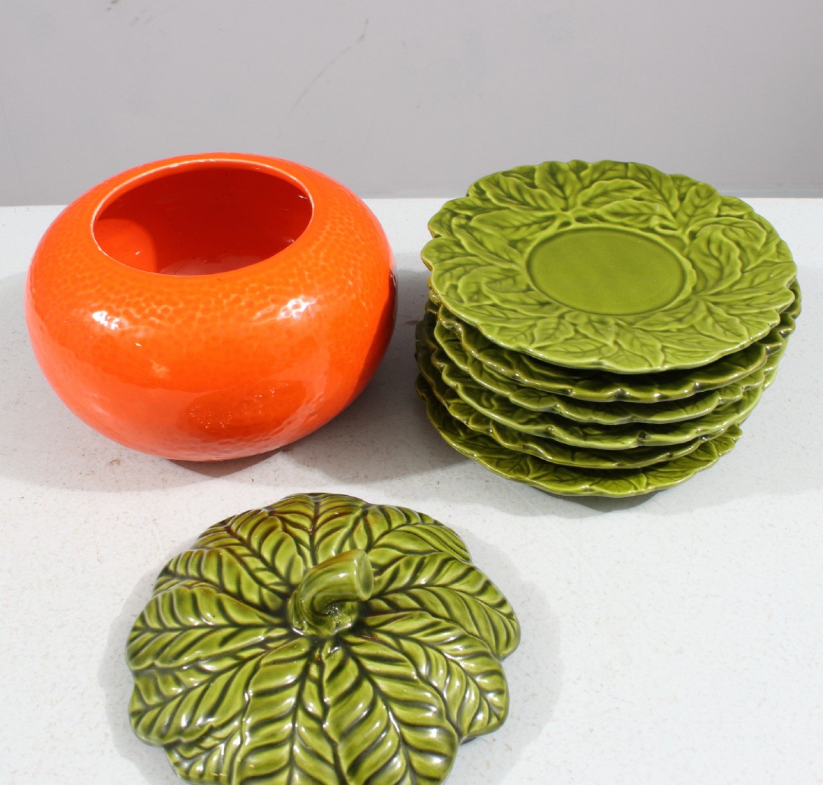 7 delar, 1st apelsinfomad terrin med lock (glasyrnagg på mynning) samt 6st assietter, höjd terrin 16 cm, diameter assietter 18,5 cm. (vån3)
