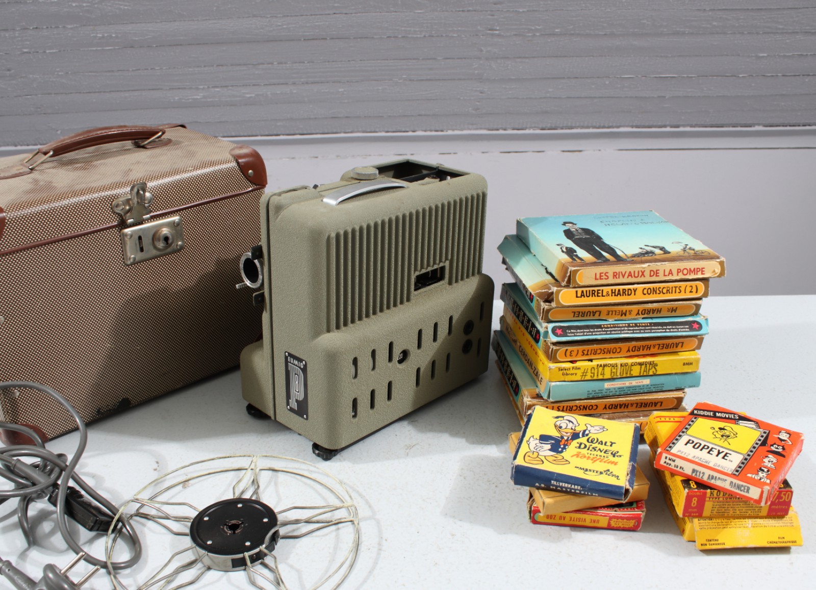 Eumig filmprojektor samt filmer (för titlar se bilder), projektor lyer vid test men snurrar ej (ingen garanti lämnas). (vån3)