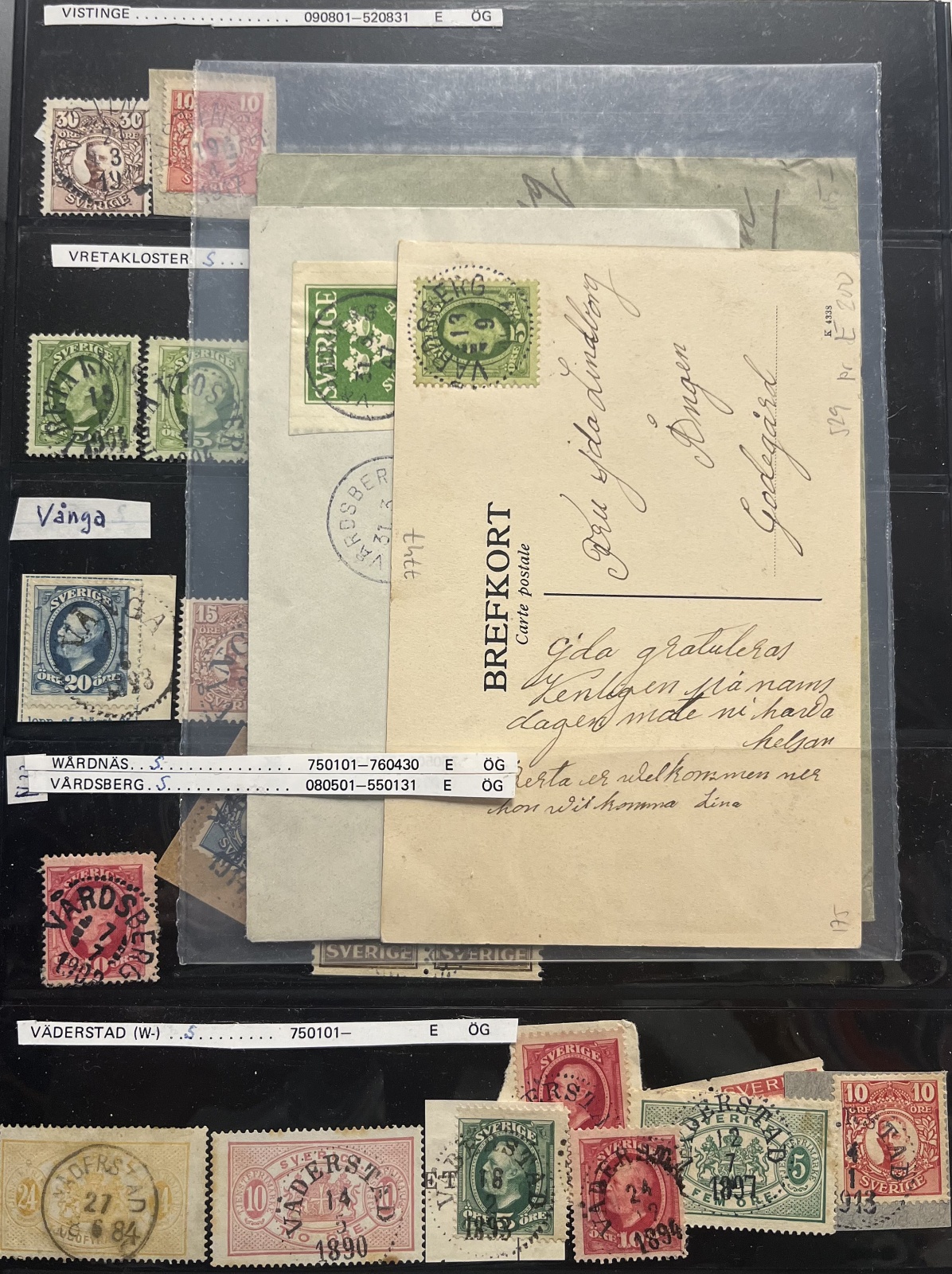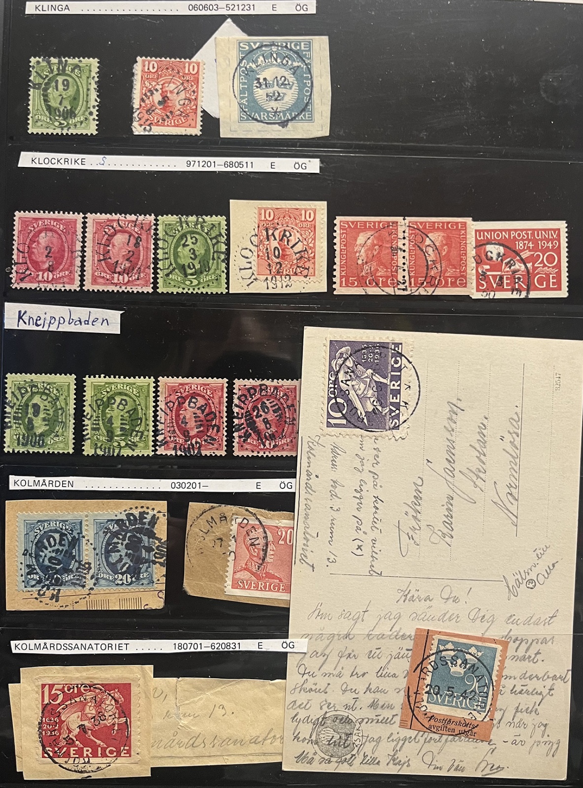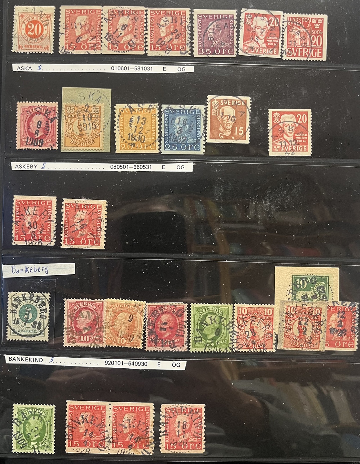 Östergötland. Samling ca 900 läsbara ortstämplar i normalkvalitet Vapen-ca 1970, mest O II-bandmärken, bl a ingår WESTRA ENEBY 1878, ROMMETORP 1919 och HORNSBERG 1880. Besiktiga.