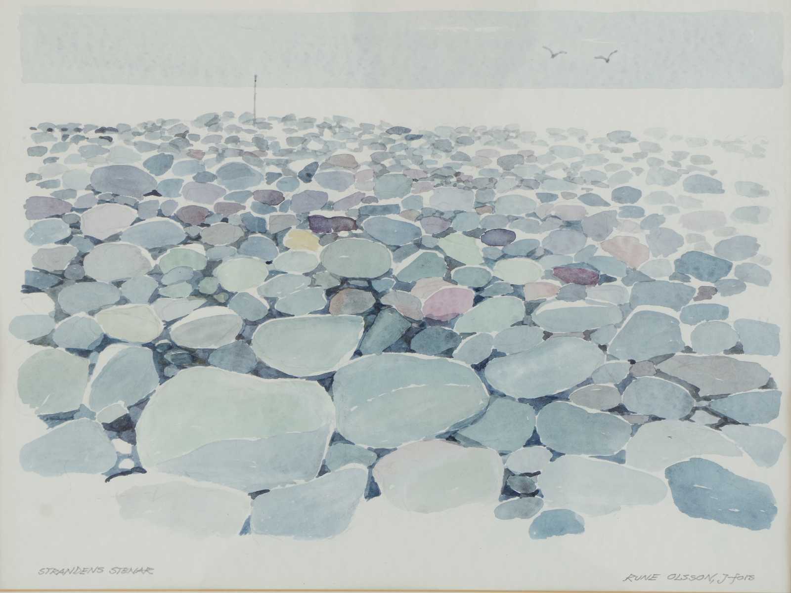 Auktioner Konst & Grafik TAVLA Rune Olsson "Strandens stenar" Rune Olsson, signerad, akvarell. 62x75cm rammått