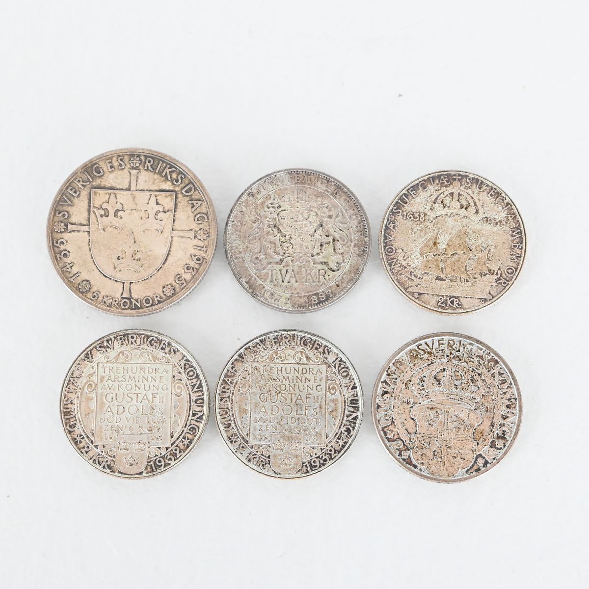 Auktioner Mynt & Medaljer Jubileumsmynt, 6 st, Oscar II, Gustaf V, 2 kronor, 5 krona, Sverige, Silver