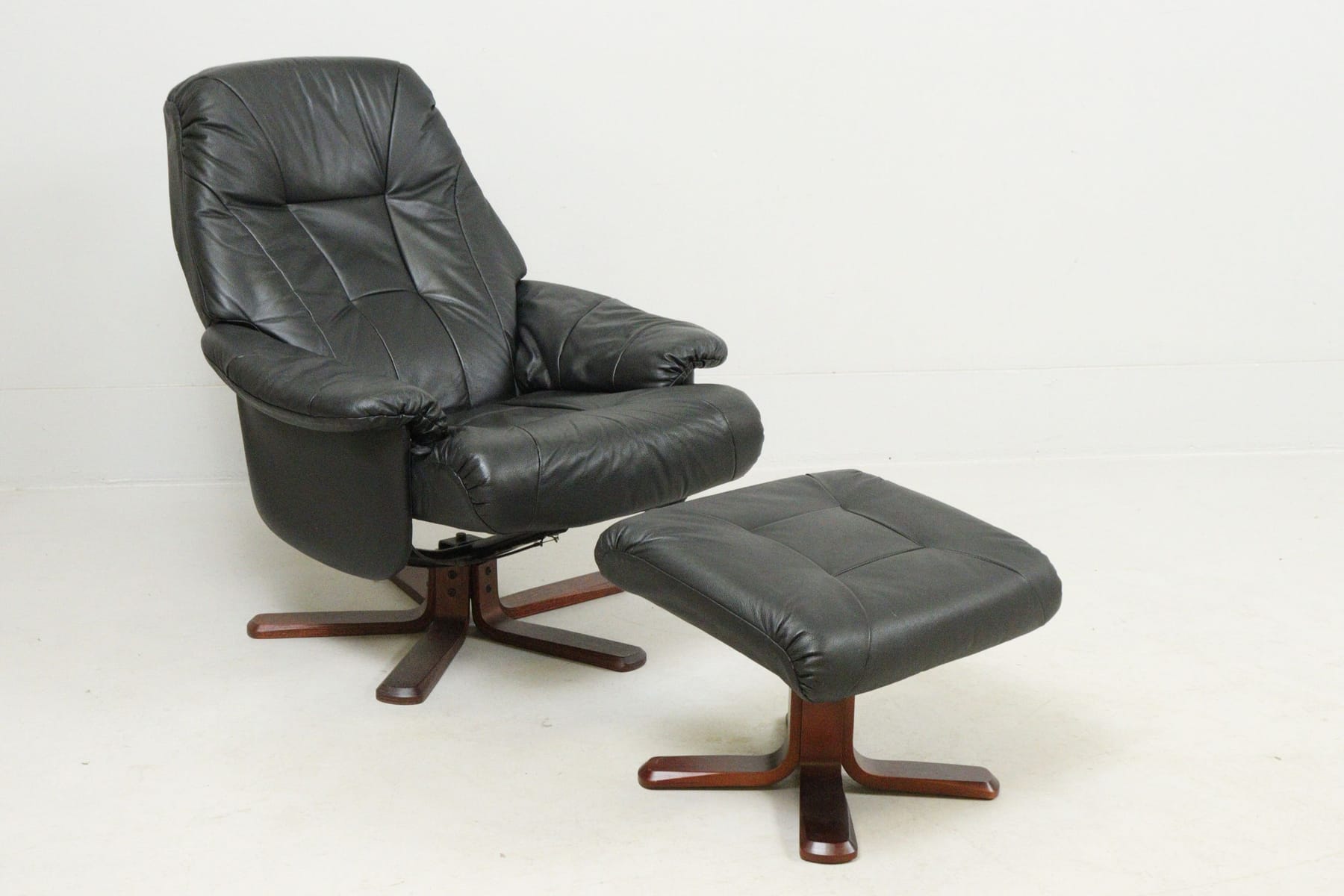 Snurrfåtölj med fotpall, skinn, fällbar rygg