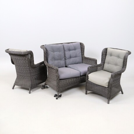 Trädgårdsgrupp, konstrotting, bord, soffa, 2 fåtöljer, soffa L=125