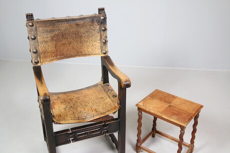 Bilder Karmstol, renässansstil, skinn och trä + bord, H = 50