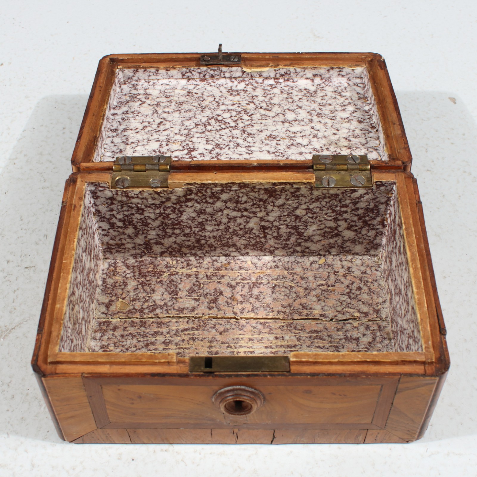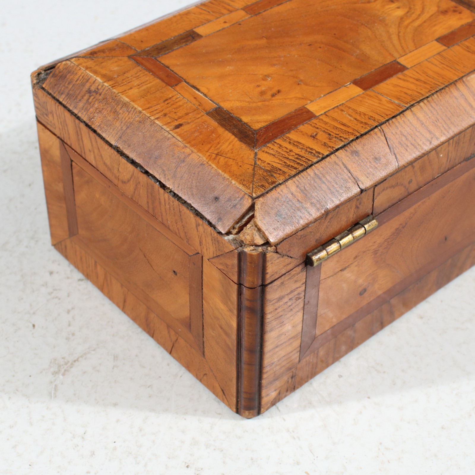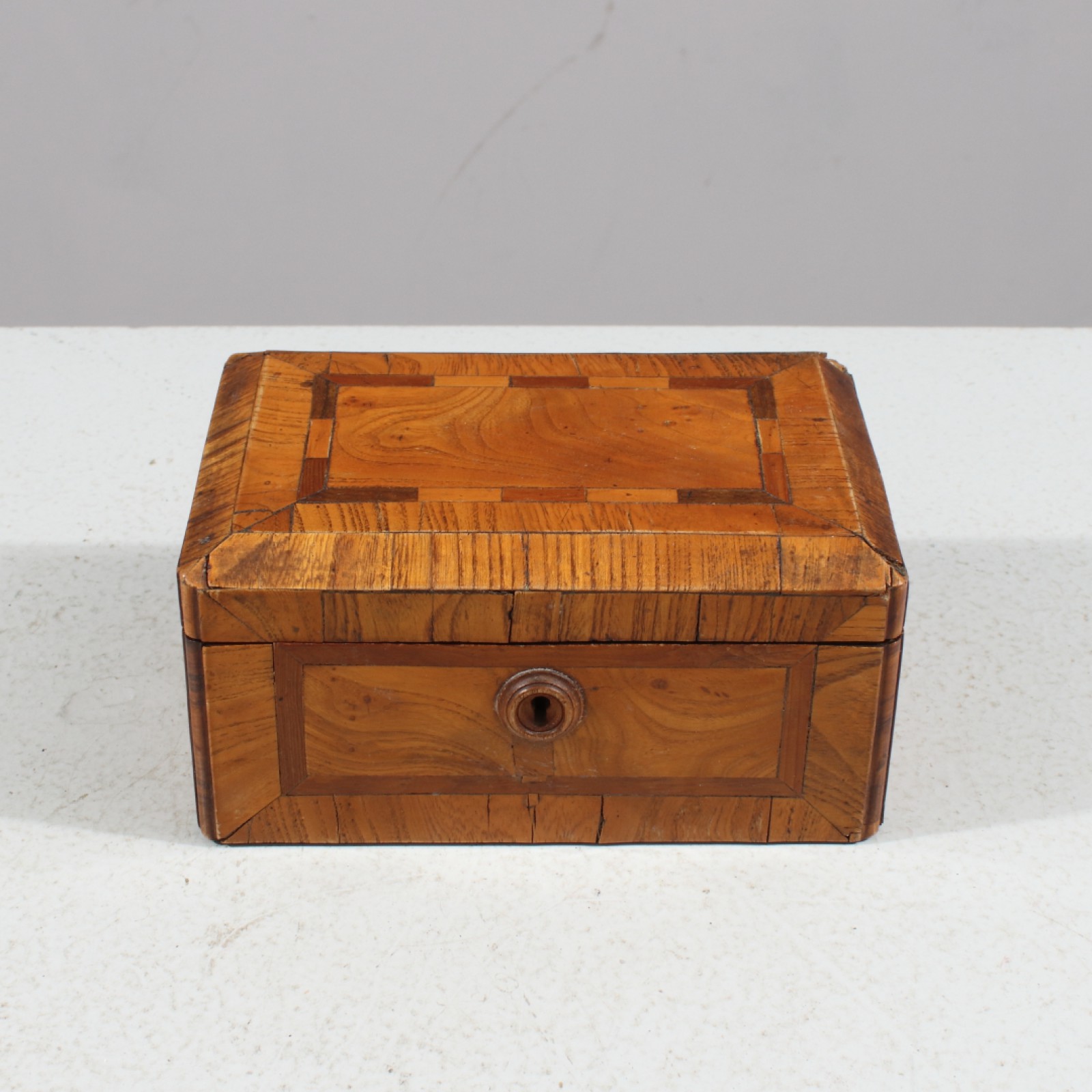 Fanerad med olika träslag, 18,1900-tal, upplåst men nyckel saknas, några mindre fanerskador, 8x16x11 cm. (vån3)