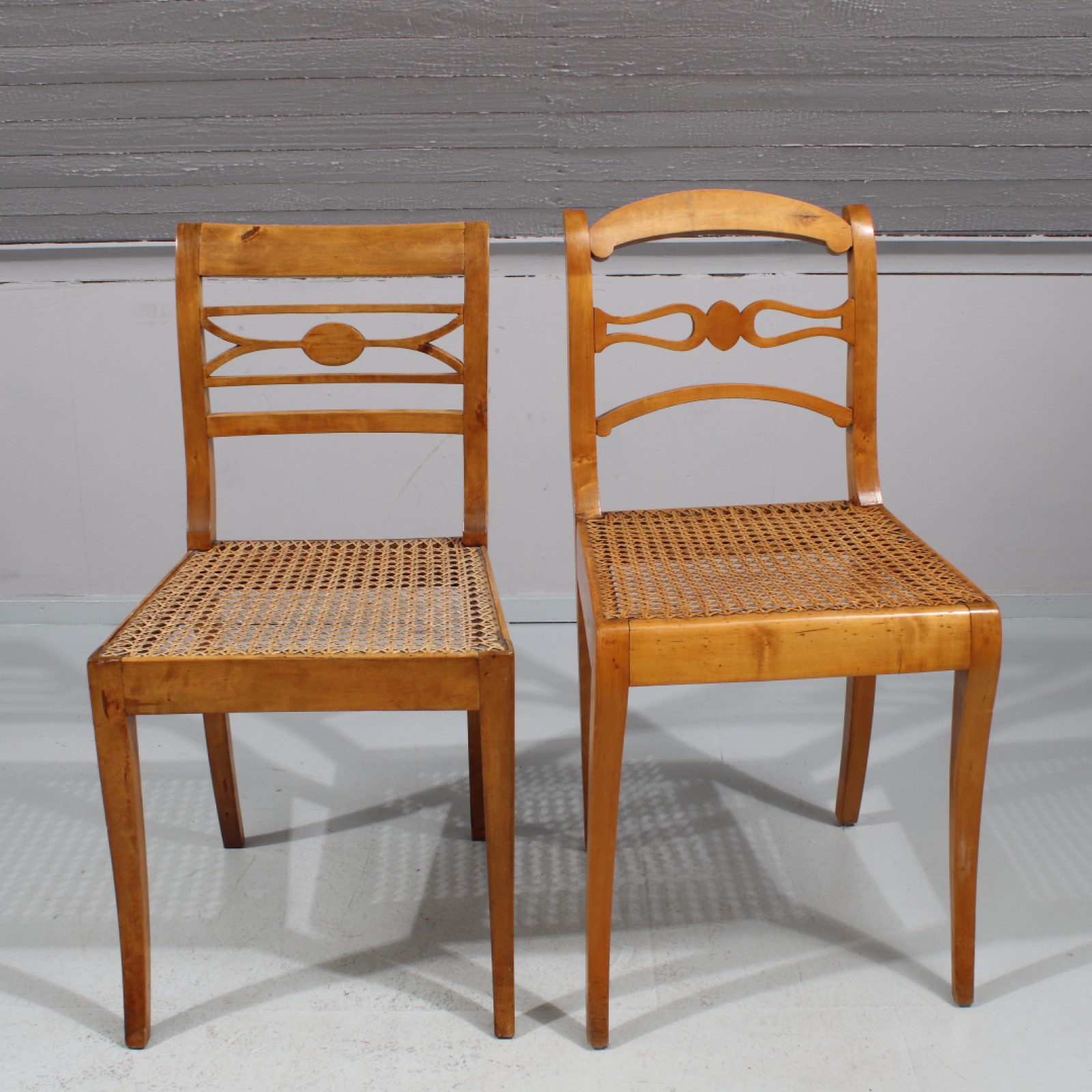 5 (3+2) stycken (snarlika), björk, sitsar i flätad rotting, åldersrelaterat slitage, Rh.80-83, B.43, Sh.44-47 cm. (vån3)