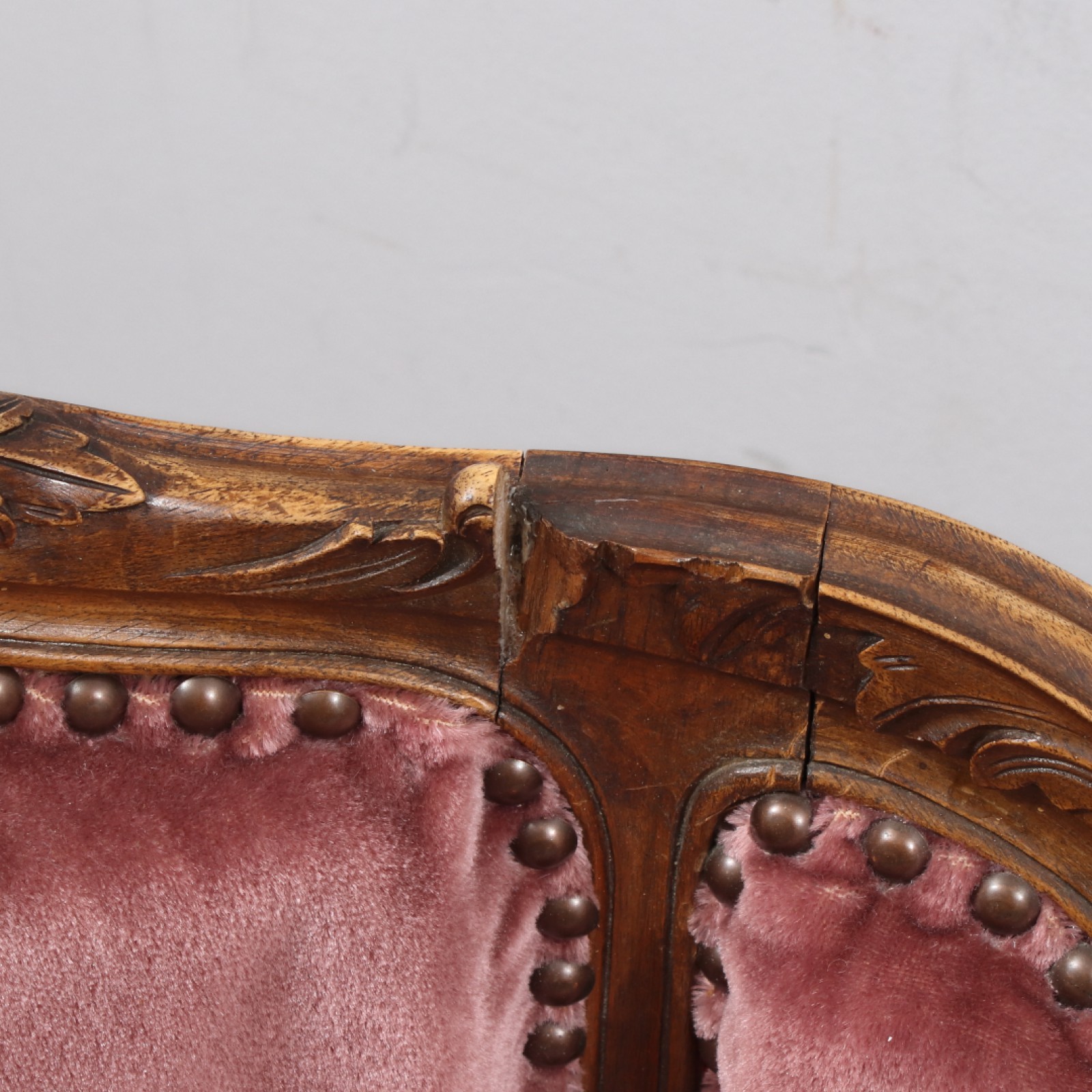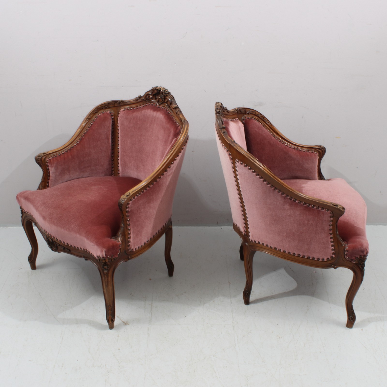2 stycken (1 par), trä med skuren dekor, plyschtyg, 1900 talets andra hälft, åldersrelaterat slitage dock 1st med mindre avslag på sidokrön (se bild), Rh.79, B.63, Sh.41 cm. (vån1)