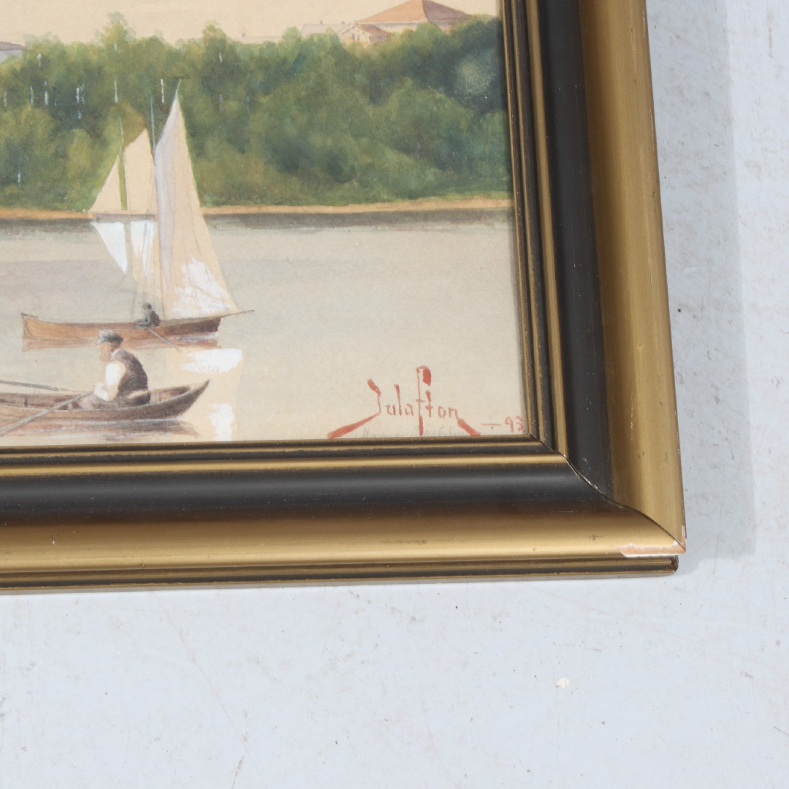 Akvarell, "Naturscen med segelbåtar och kyrka", daterad julafton -93 (1893), ram 45x59 cm, bild 34x48 cm. (vån3)