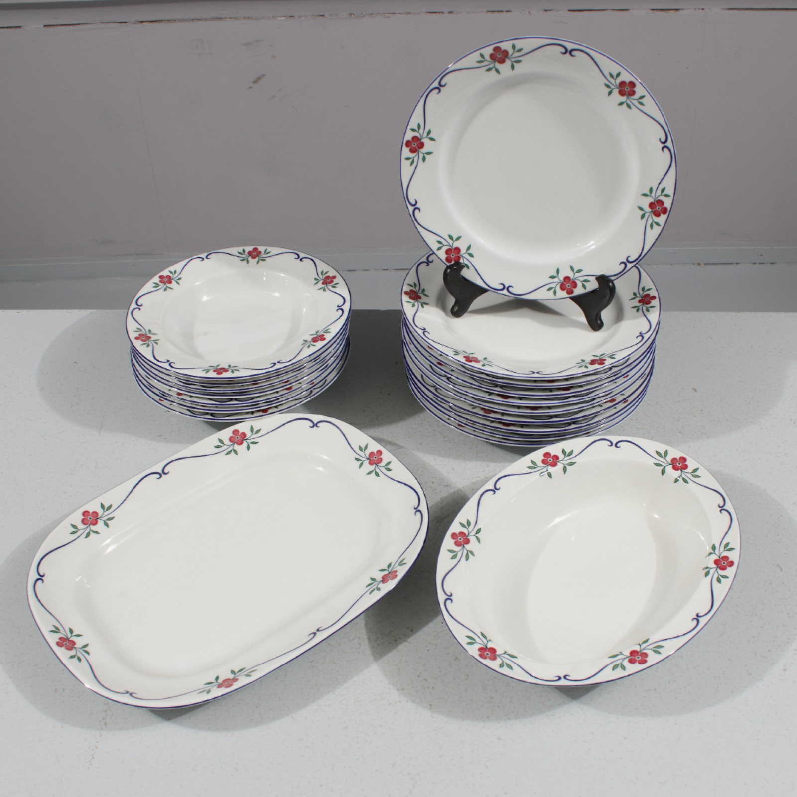 19 delar, 10st mattallrikar ø.23,5 cm, 7st djupa tallrikar ø.20,7 cm, 1st skål 5,4x27x21 cm samt 1st uppl.fat 31,4x24 cm. (vån3)