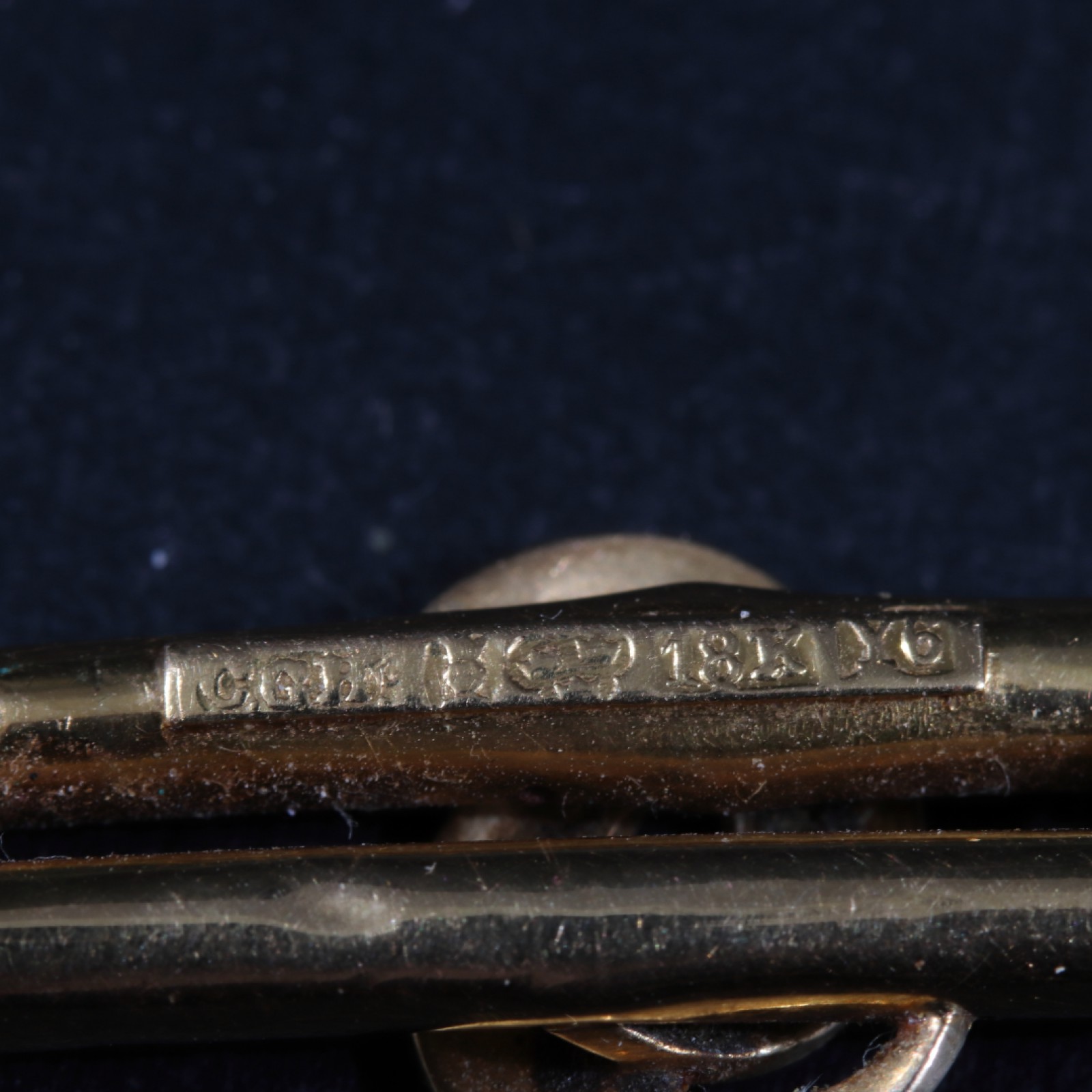 18 karat guld, dekor med små pärlor (några stycken saknas), längd 42 mm, vikt 3,10 gram. (vån3)