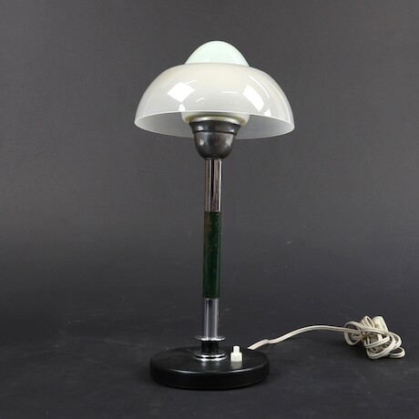 Bilder Bordslampa, metall, trä och glas, 1900-talets tidigare hälft, H=38, övre delen på skärmen avtagbar