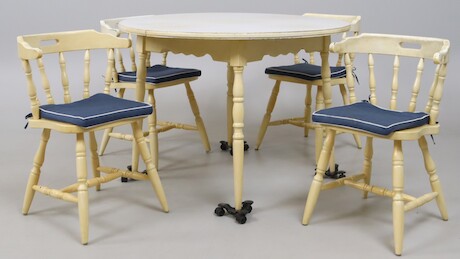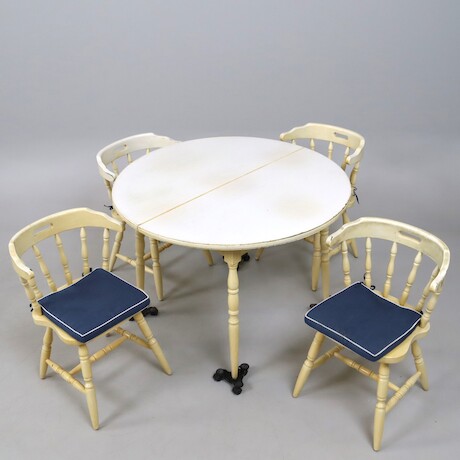 Bilder Bord + karmstolar 4 st, 1900-talets andra hälft, bordets diameter 110 cm
